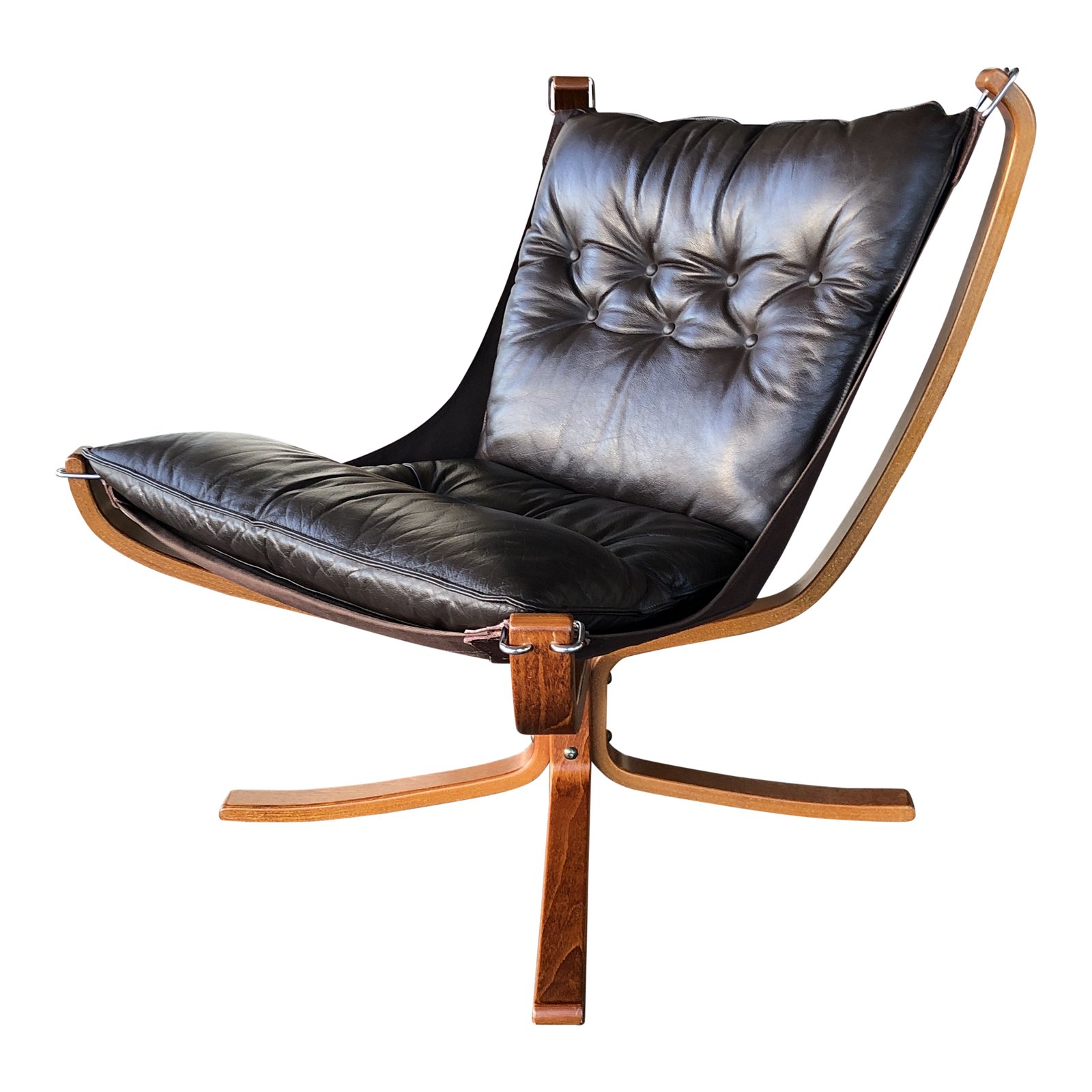 Design Plus Gallery presents Mid Century Falcon brown leather lounge chair made in Norway at Vatne Mobler design school. This wonderful easy chair was designed by Sigurd Ressell. Very light and comfortable.