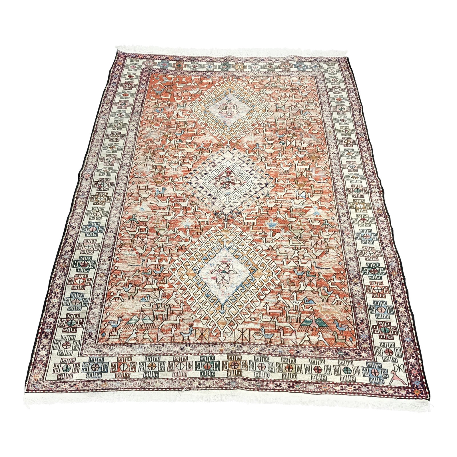 Design Plus Gallery presents a Silk Sumak Area Rug. Brilliantly colored against a white ground, the pattern Handcrafted using a historic technique that’s older than traditional piled carpet weaving, this weave requires the work of the most skilled artisans. No knots are tied in the process which makes the textile that much stronger. The technique, similar to that for Kilims, creates great durability that will last in high traffic areas. Unlike Kilims, Sumak rugs are not reversible as the backside has threads that create a cushion that is more thick and durable as a floor covering.