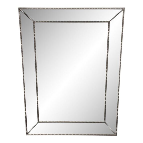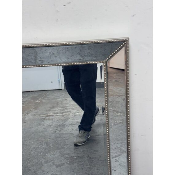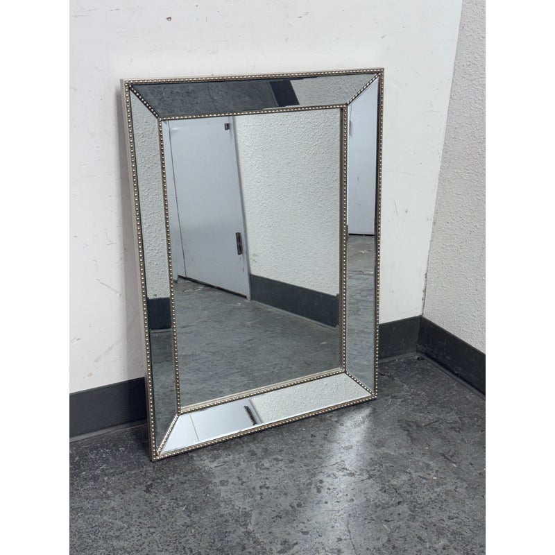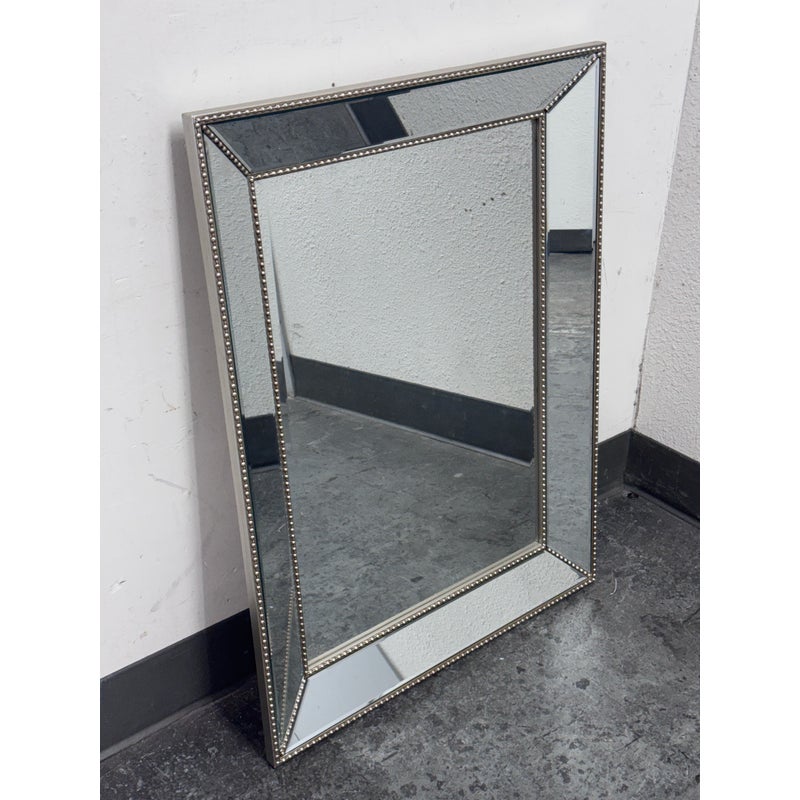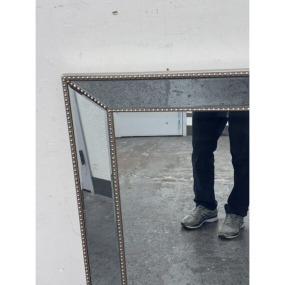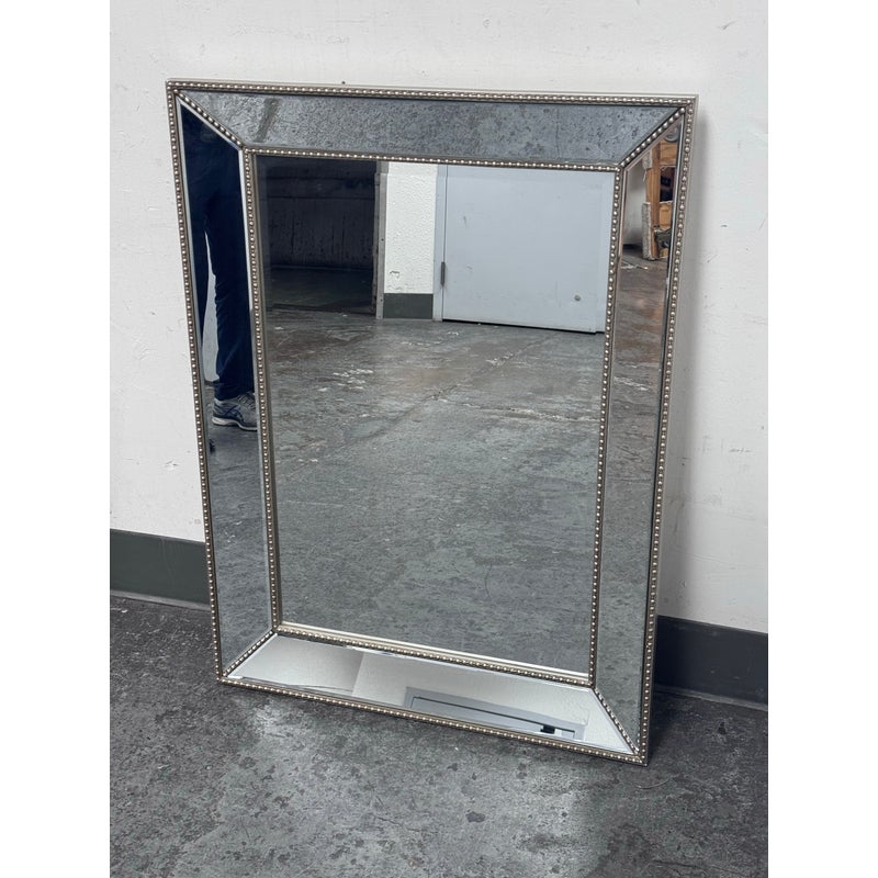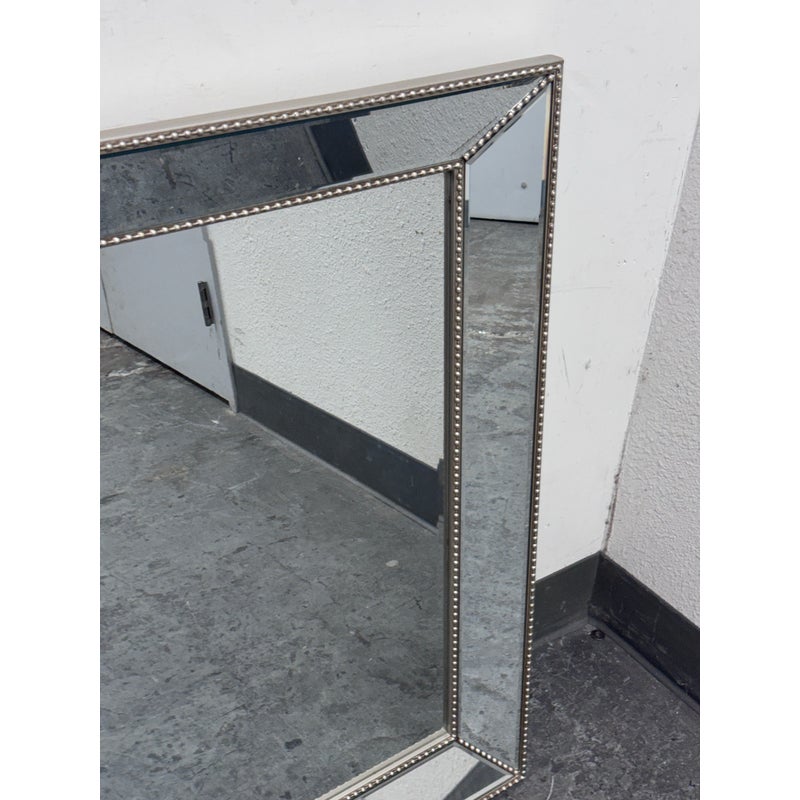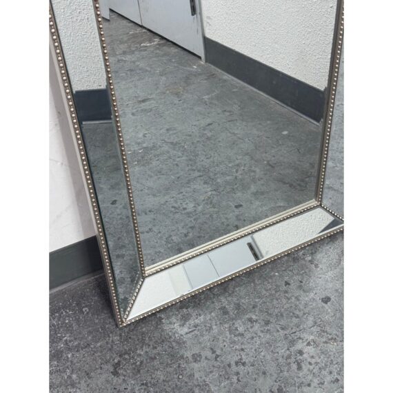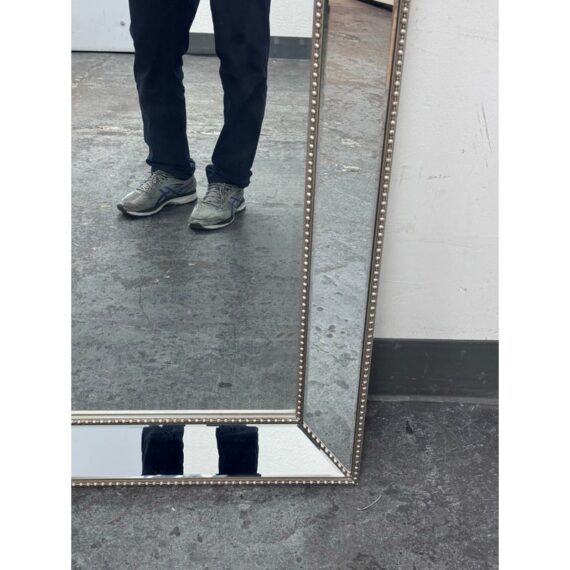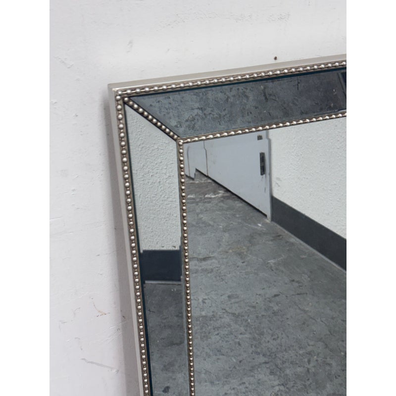 Design Plus Gallery presents a Beaded Frame Mirror. This generous scaled beveled mirror features an antiqued silver finish with elegant beaded ball detailing on the frame for a timeless classic design from the entry to the master bath. Can be hung vertically and horizontal. In good condition, minimal wear from usage.