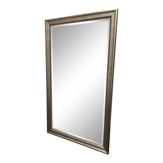 Design Plus Gallery presents a large framed wall mirror. The mirror is wood with an antiqued silver finish. The mirror insert is beveled. The wall mirror can be hung vertically or horizontally.