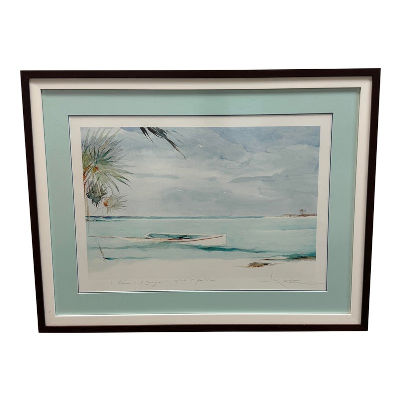 Design Plus Gallery presents #110 of 250 Beach Print of the Lesser Antilles Island, Saint Martin. The watercolor print has a rowboat gently resting on calm waters, perfectly capturing a serene and peaceful moment. The artist’s delicate brushstrokes and soft color palette bring the image into a soft take on life, with gradients of blues and earthy tones that blend harmoniously. Custom framed and double matted. In good condition, minimal wear.