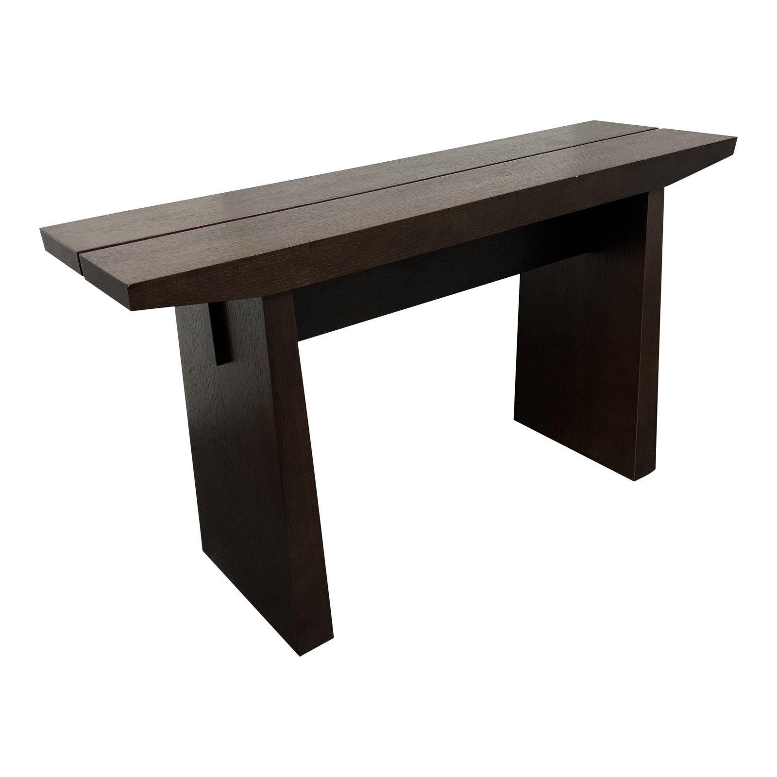 Design Plus Gallery presents the Hida Wood Oak Veneer Console by Sitcom Furniture. Mission style console given a dark warm finish. Wear is consistent with use; table is in good condition. It will serve well as an entry or console table.