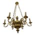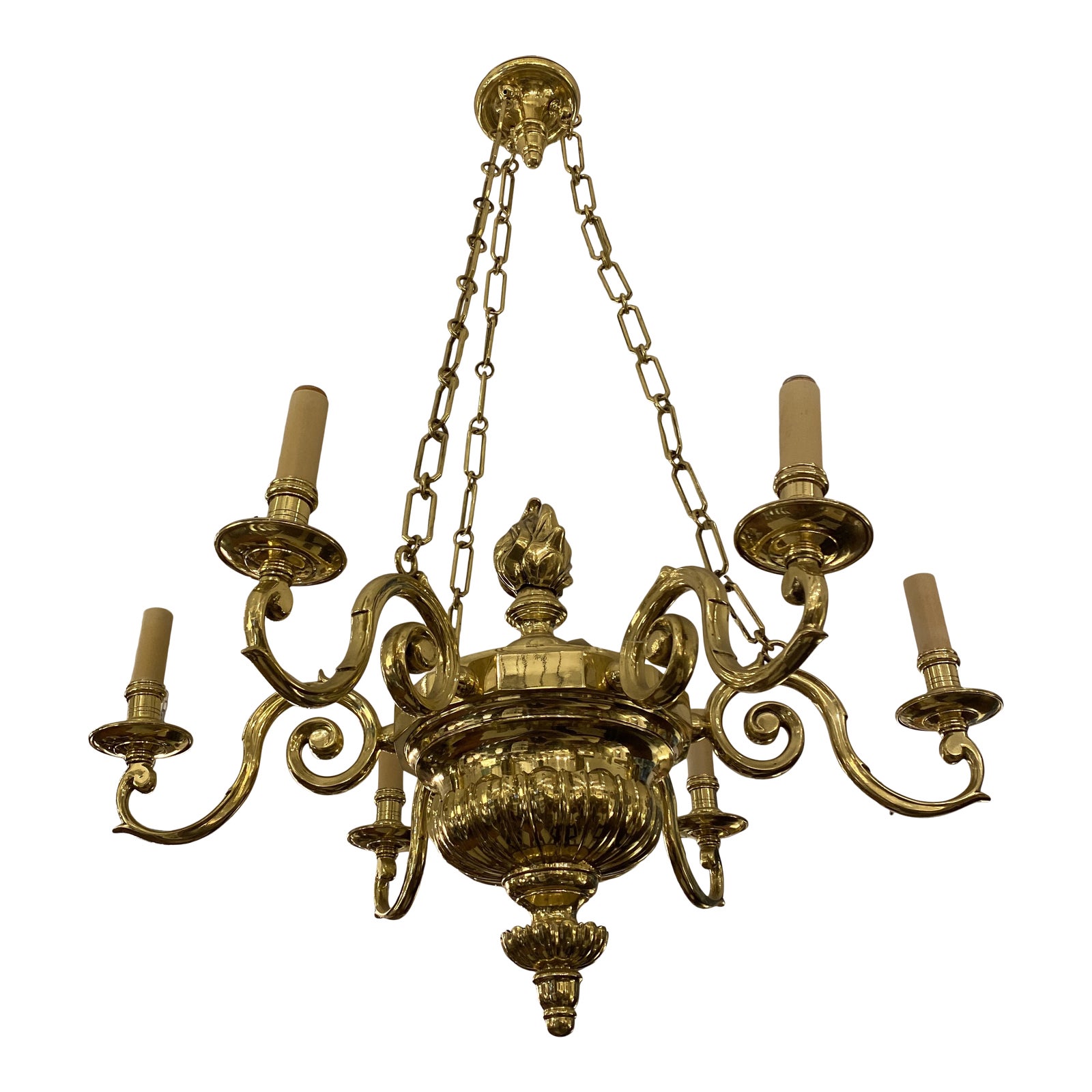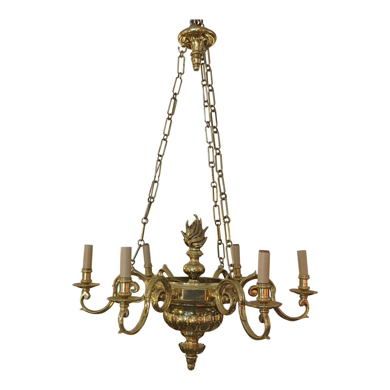 Design Plus Gallery presents a 1975 Chapman 9-Light Brass Flame ChandelierSix scrolled arms with each carrying a light. The top surface has a fire torch. The brass is shiny and polished. Three chains support’s the chandelier from its ceiling mount. The chains can be shortened if needed. Can light up any room.