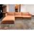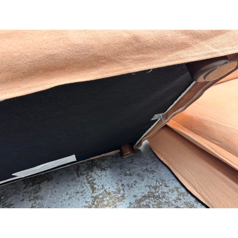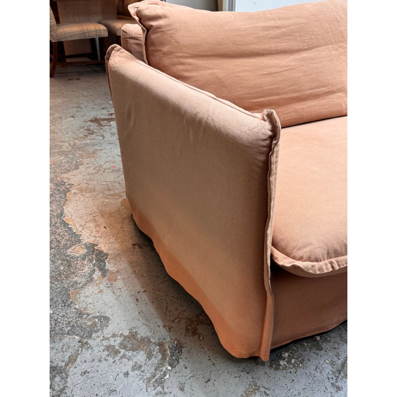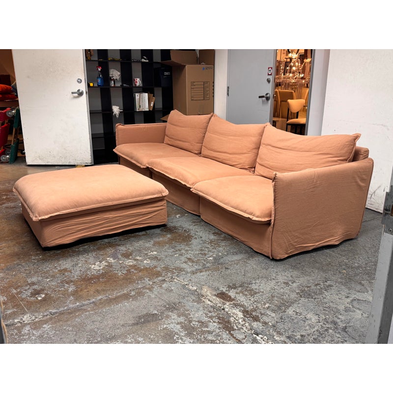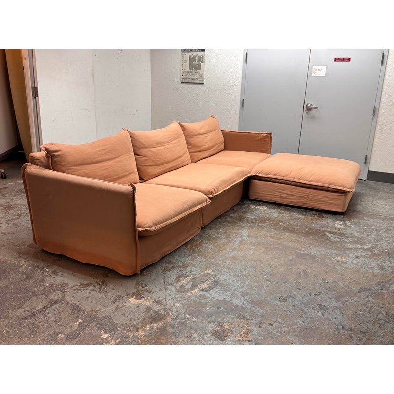 Design Plus Gallery presents the Neva Modular Sofa with Ottoman from Sixpenny. This low-profile sofa has generous seating with deep cushions and supportive back pillows making it deal for everyday use. The contemporary sofa with matching ottoman is upholstered in their Sun Dazed Coral slipcover. Its modular layout allows flexibility in placement, while the oversized ottoman can serve as a chaise extension, coffee table alternative, or additional seating. Clean lines and a tailored silhouette make this piece easy to integrate into modern, transitional, or eclectic interiors. As there is visible fading from sun exposure and stains to the fabric the seating would benefit from professional cleaning or slipcover replacement. It is in good condition with visible and minimal wear from usage.