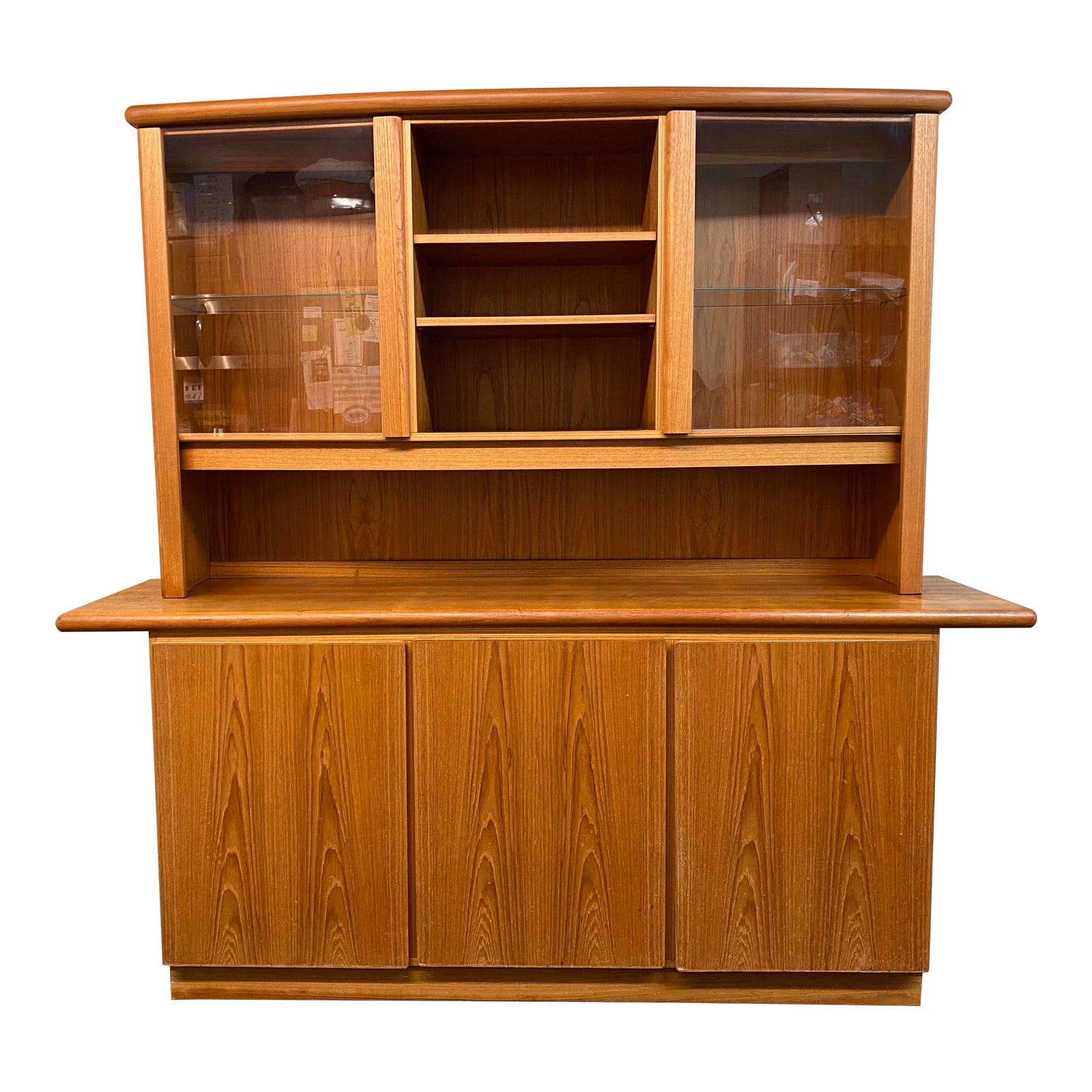 Design Plus Gallery presents a Skovby Danish Two Piece Teak Hutch. Counter surface has generous space + over hang for entertaining. Adjustable open shelving occupy the majority of the base behind the rich grain of the teak doors. A bank of shallow drawers lined with felt aligns on the left side of the base. Display space on top has two glass doors with one glass shelf in each compartment. Integrated lighting shines through. Middle compartment open with two adjustable shelves. Visible wear on counter surface with water marks (pictured.) Made in Denmark. Light switch located on top of unit.