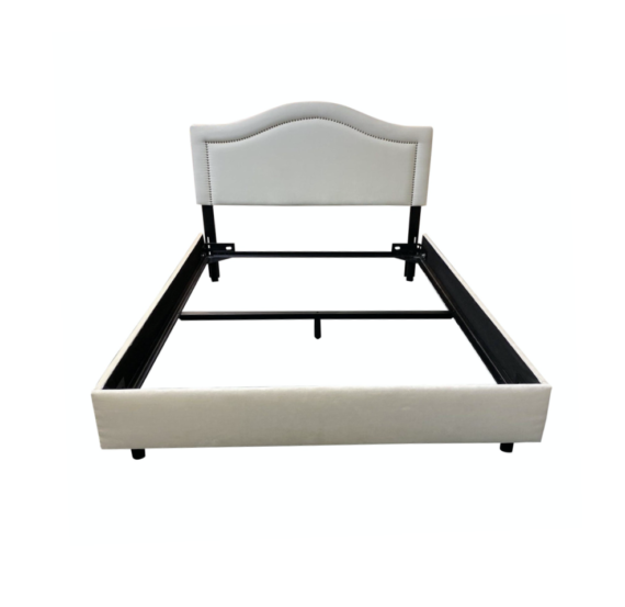 Design Plus Gallery presents a Queen Bed from Skyline. Traditional details such as the camelback silhouette and antiqued brass nailheads flatter the soft velvet upholstery that wraps the whole piece.
