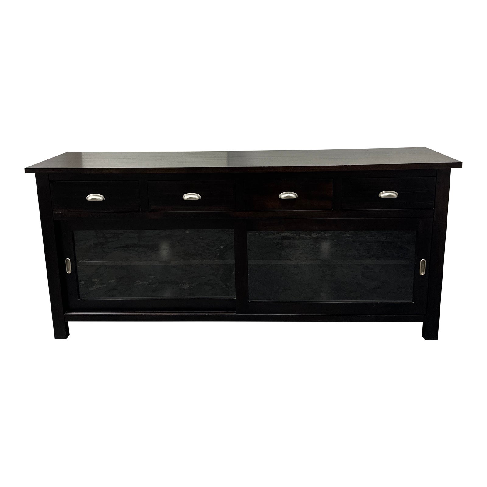 Design Plus Gallery presents a Sideboard/ Media Cabinet by Slater Marinoff. This cabinet is a functional and versatile piece of furniture. Constructed from woods and glass. Featuring a rich, dark espresso finish, this cabinet exudes a timeless elegance that will complement a variety of decor styles. The four drawers with cup metal handles offer ample storage space for organizing media accessories, remotes, or other items. The two glass paneled sliding doors adds a glimpse into the cabinet’s interior. Inside, you’ll find a single inner shelf. Additionally, the cut outs on the back allow’s for easy passage of electronic wires, keeping everything neat and tidy. In good condition, with visible and wear from usage + age. .