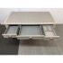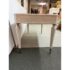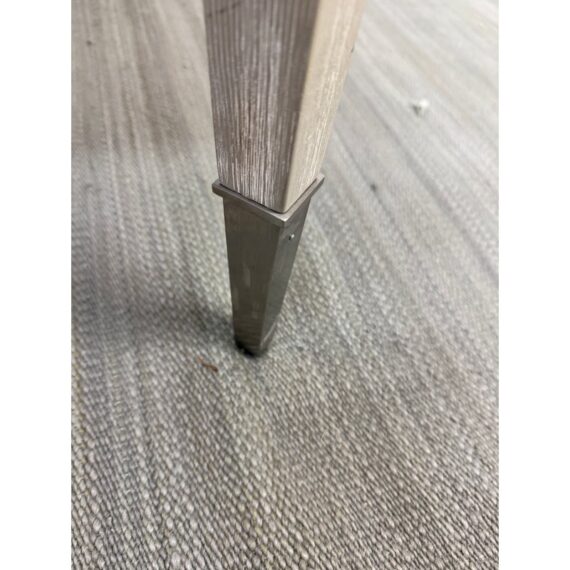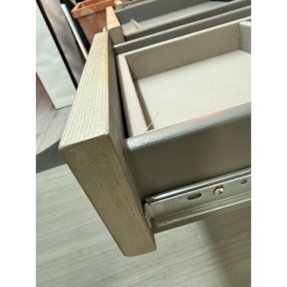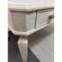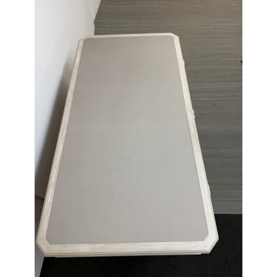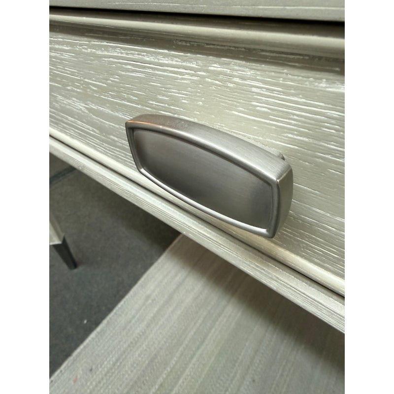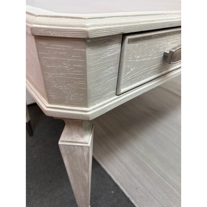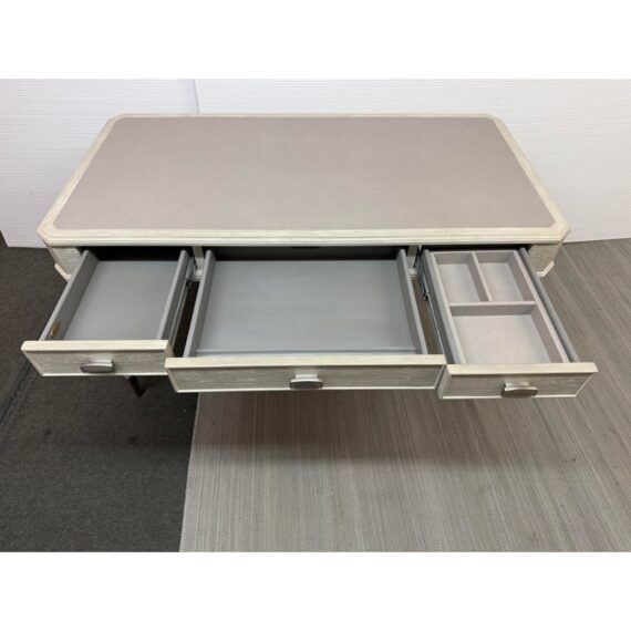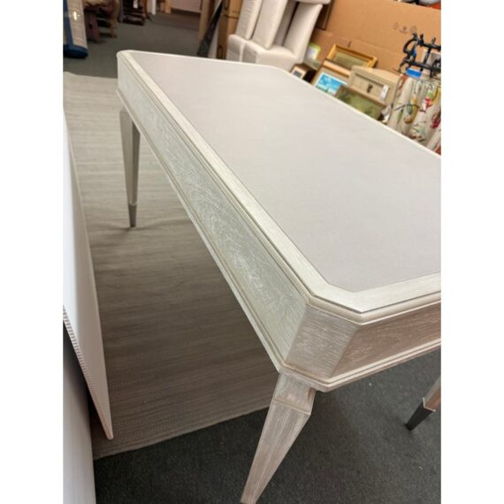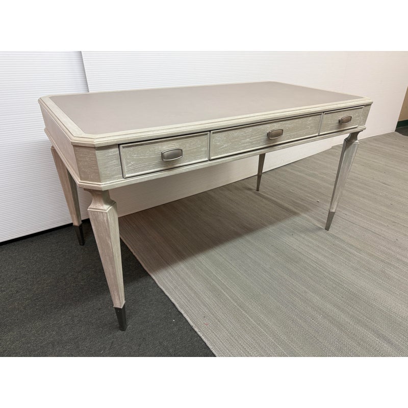 Design Plus Gallery presents the Chloe Writing Desk from Sligh Furniture. The elegant pearl hued desk makes a quiet statement. Featuring three storage drawers, metal ferrules in a brushed nickel finish at the bottom of tapered legs, and a writing surface of gray faux leather. Notably, the desk includes a removable pencil tray in the center drawer and a partitioned leather drawer box that can be used in either the left or right-facing drawers. The lovely writing desk is designed to be equally suitable for a dedicated home office or a bedroom work space. Light surface wear; condition is good.