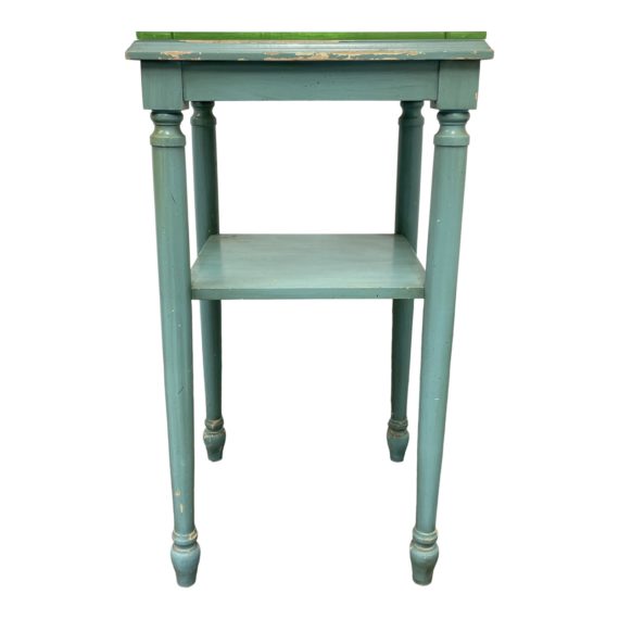 Design Plus Gallery presents a Sligh Furniture Shabby Chic Turquoise Side Table. Solid turned and elegant moldings were manufactured in Grand Rapids Michigan during the mid century. Lower shelf offers display space and reinforces structure. There is visible wear through out, especially with the paint. Top has a piece of glass cut to size. Side Table is in good condition and very charming!