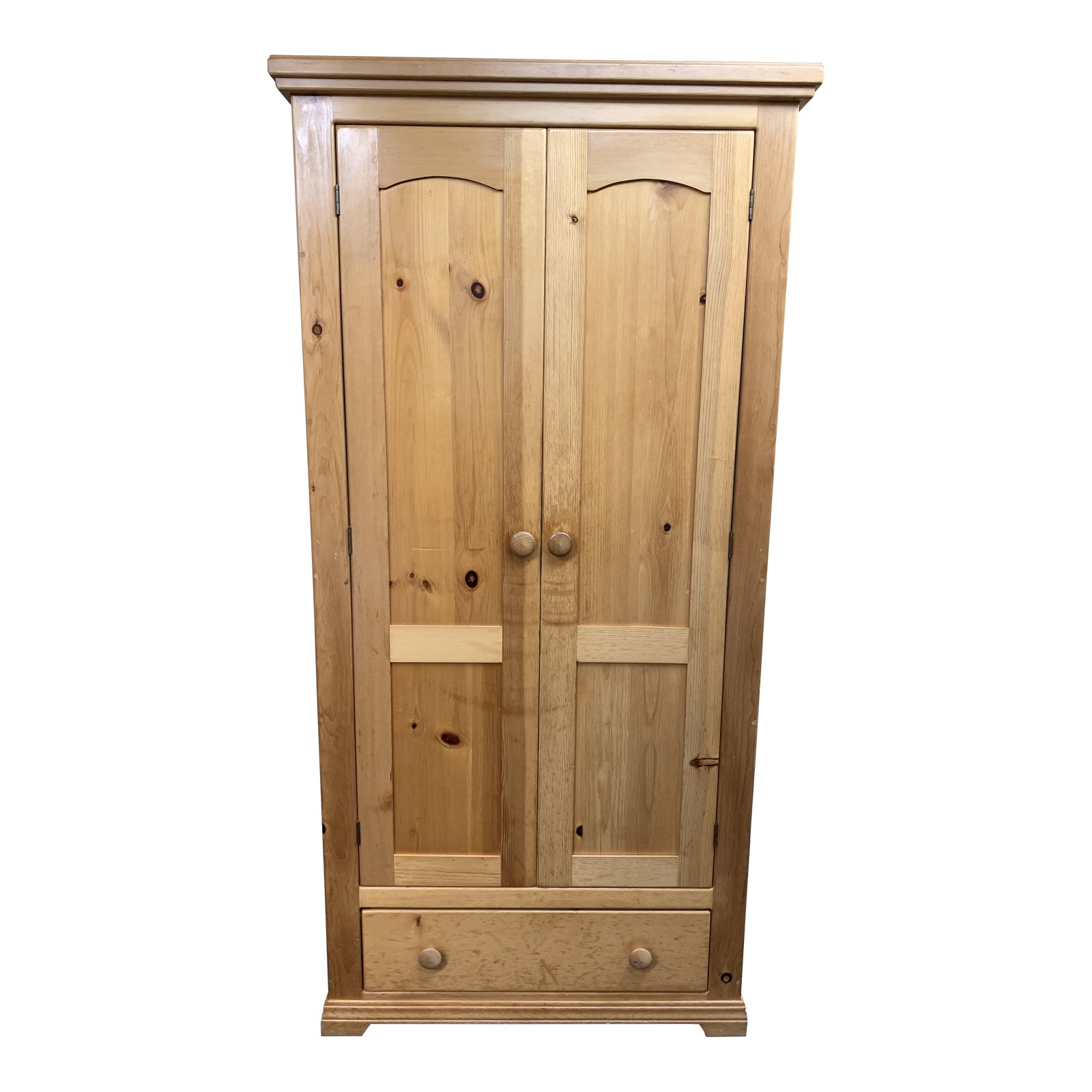 Design Plus Gallery presents a Pine Armoire. Simplicity itself, the simple silhouette does double duty as storage cabinet with adjustable shelves, or as media armoire. Shaker details on the doors and turned knobs on drawer at bottom of unit.