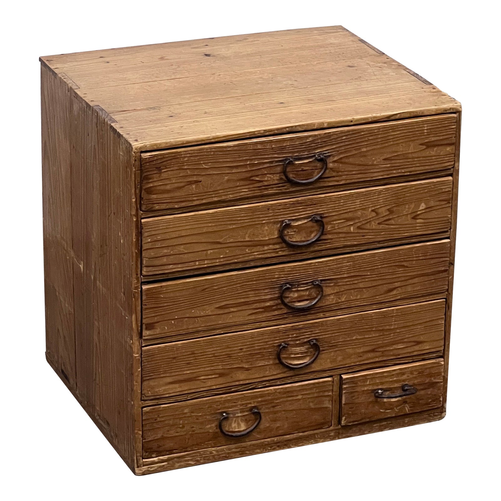 Design Plus Gallery presents a 19th Century Japanese Tansu. A charming and versatile piece of furniture. Its compact size allows it to fit comfortably in any room or space, making it perfect for both large and small environments. The tansu features an elegant design with four large drawers positioned at the top. Below the larger drawers, there are two additional drawers, one medium-sized and one small, which are side by side. These smaller drawers are ideal for storing smaller items such as jewelry, accessories. The tansu is skillfully crafted from high-quality wood and features traditional Japanese joinery techniques, ensuring its durability and longevity. The hardware, including the drawer pulls and corner accents, is made of metal and adds a touch of elegance and sophistication to the overall design. Visible and minor wear from usage + Antique age.