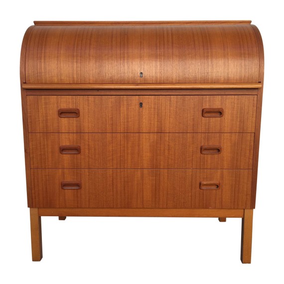 A beautiful, one-of-a-kind, small roll top desk in teak. The desk has a teak veneer finish and was made in the 1970s. It has lots of storage and the work surface pulls out once the roll top is up. A unique Mid-Century Modern style desk perfect for your study or library.