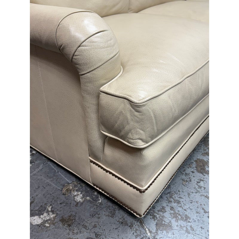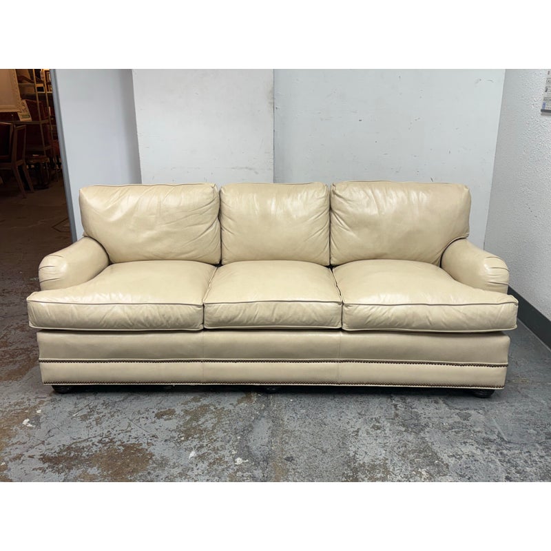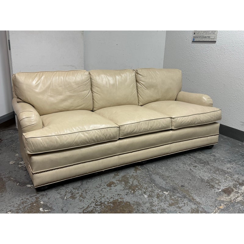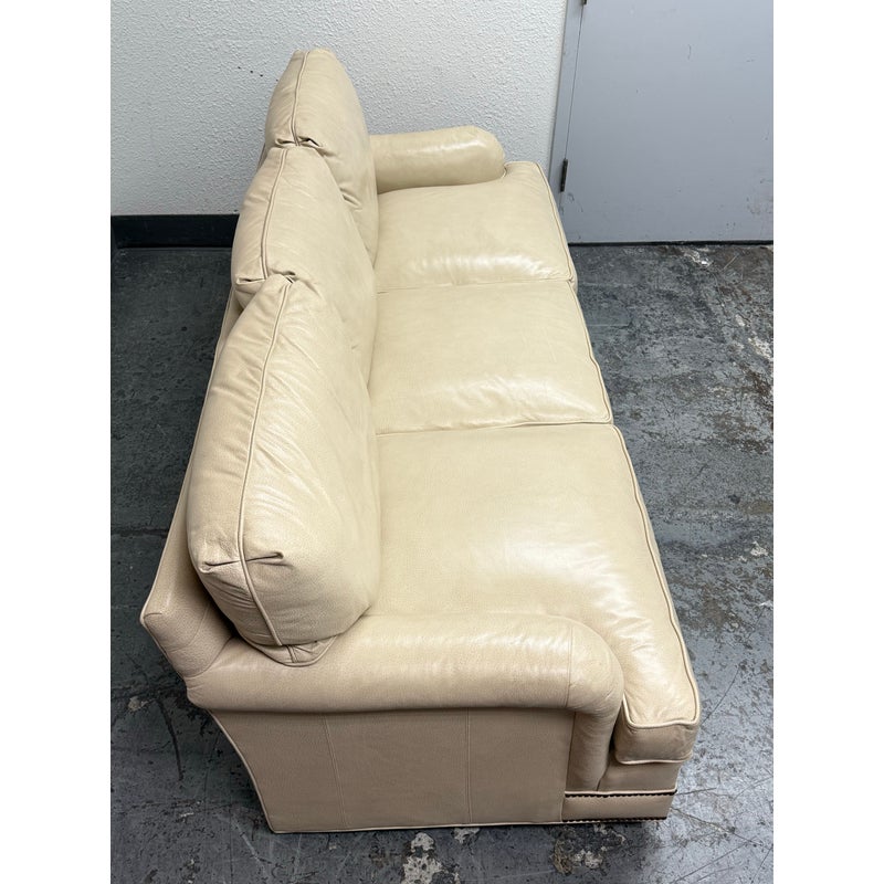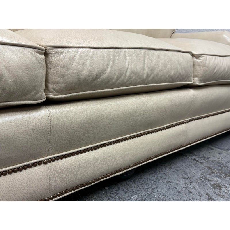 Design Plus Gallery presents an Off White Leather Sofa from Smith & Gaines. The sofa is an English Traditional style that will always be promising in a buttoned-up home. The entire sofa is wrapped in top-grain leather of a most neutral off-white tone, parchment. The arms are nicely rounded with thoughtful pleats for its smooth transition. Two rows of brass nailhead trim at at the base. Three x three cushions at seat and back for plush comfort with upright lounge appeal. Overall the sofa is in good condition for its vintage age + use.