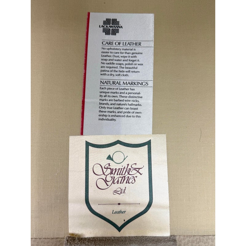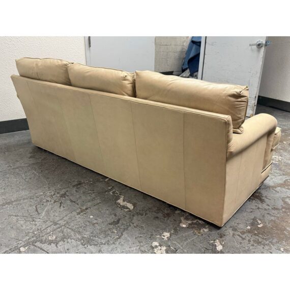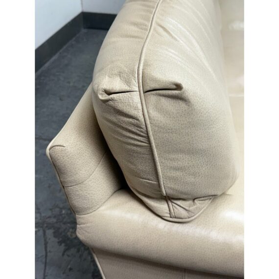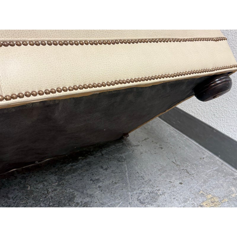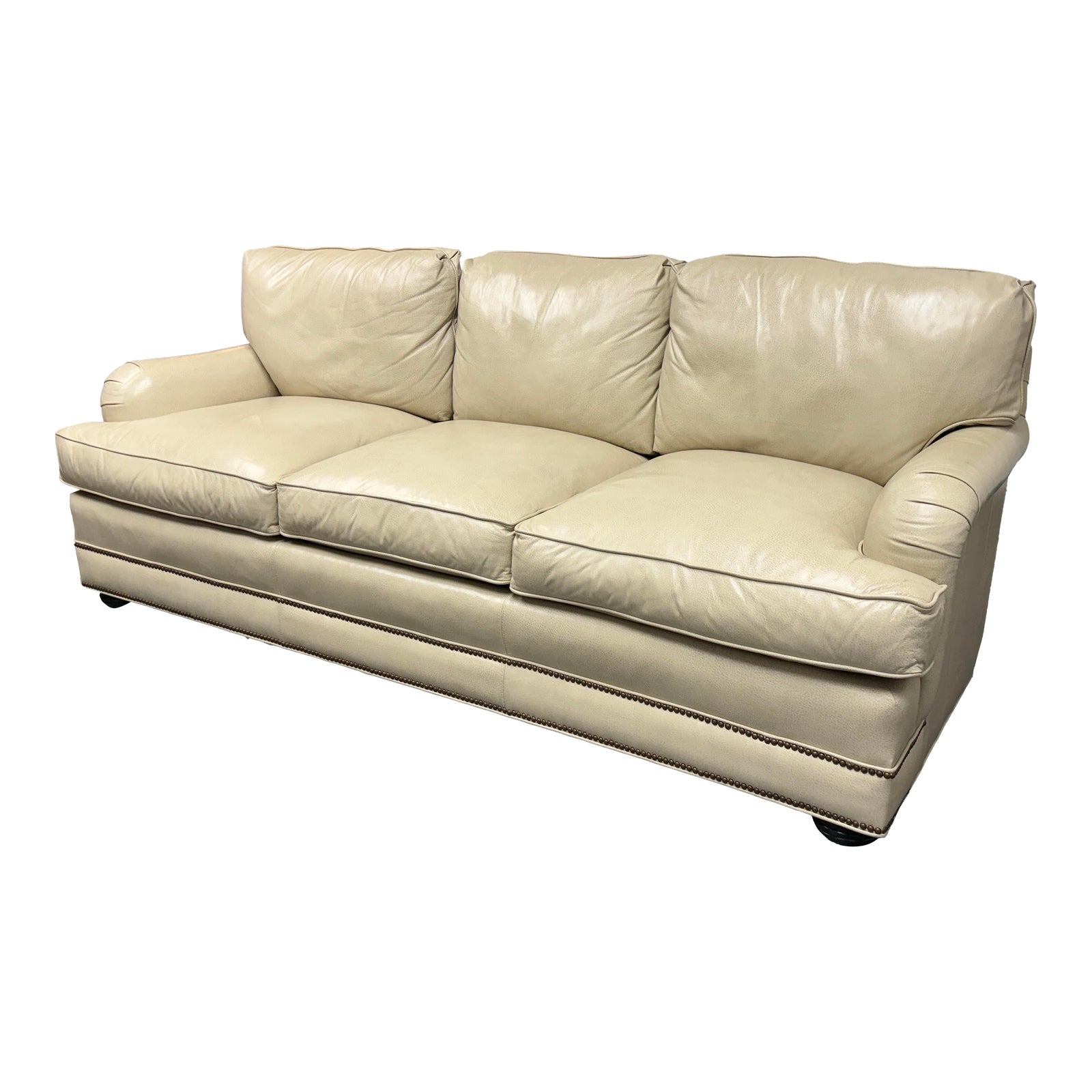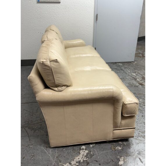 Design Plus Gallery presents an Off White Leather Sofa from Smith & Gaines. The sofa is an English Traditional style that will always be promising in a buttoned-up home. The entire sofa is wrapped in top-grain leather of a most neutral off-white tone, parchment. The arms are nicely rounded with thoughtful pleats for its smooth transition. Two rows of brass nailhead trim at at the base. Three x three cushions at seat and back for plush comfort with upright lounge appeal. Overall the sofa is in good condition for its vintage age + use.