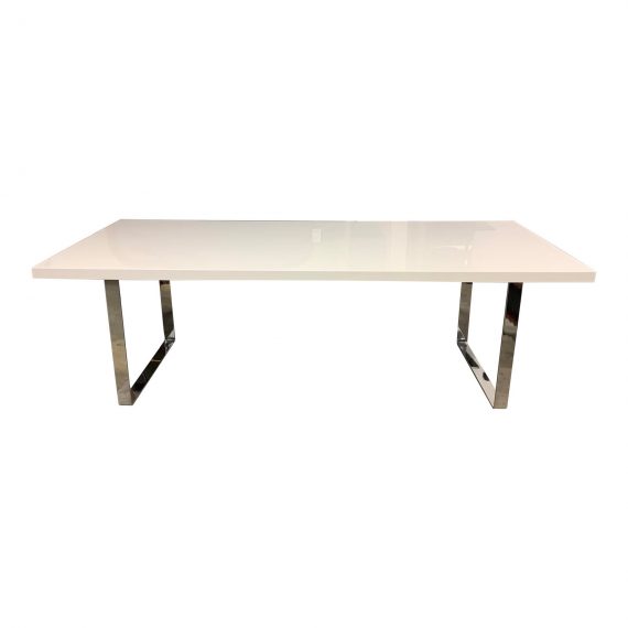 Design Plus Gallery presents a Soho Concepts Bophorous White Lacquer Dining Table With Steel Pedestal Base. Top is equally balanced with the proportion of the solid steel sleigh legs. Steel is polished to reflect beautiful surroundings. Top is a bright white lacquer in a glossy finish. Visible wear on one of the corners and small marking.