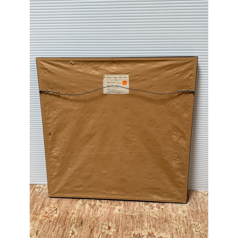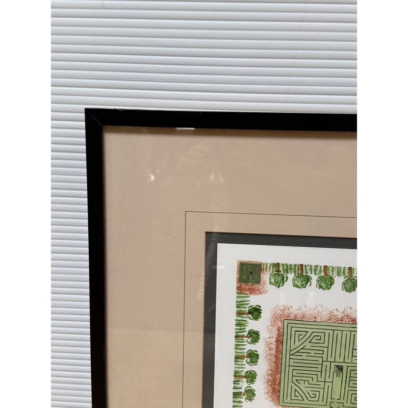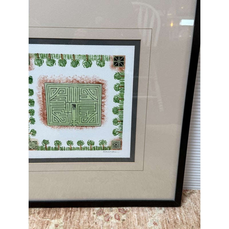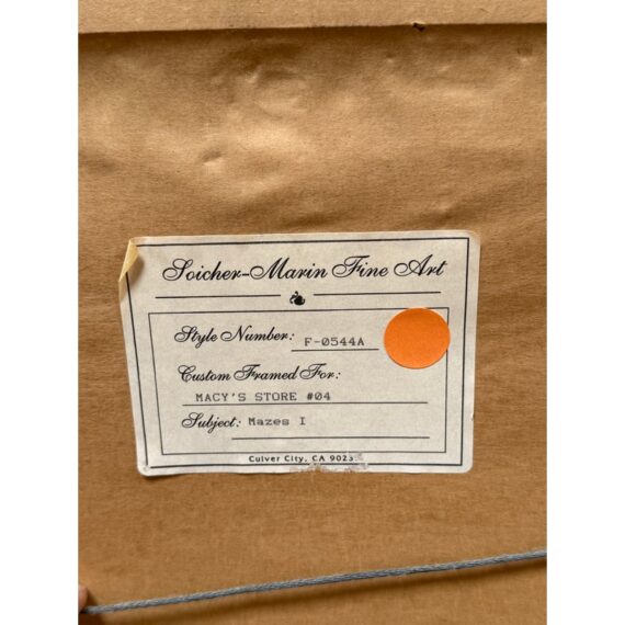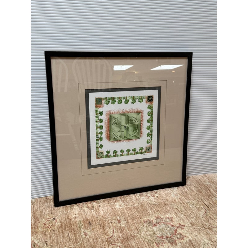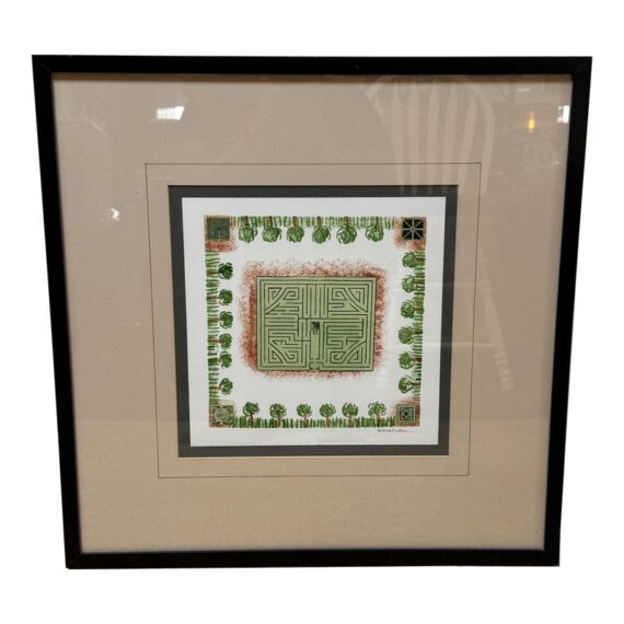 Design Plus Gallery presents “Mazes I” Print by Barbara Embree. The print was distributed by Soicher-Marin and was from an original watercolor painting by Los Angeles-based artist Barbara Embree. They were able to reproduce with brilliant color and exquisite detail. The geometric nature of the subject is enhanced by the wide matting and delicate frame. Condition is good with minimal surface wear for its overall age + use.