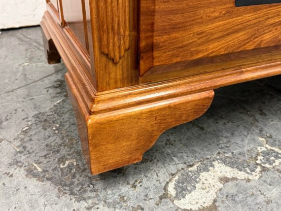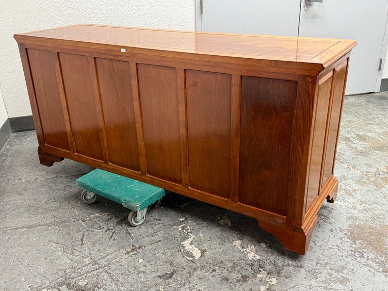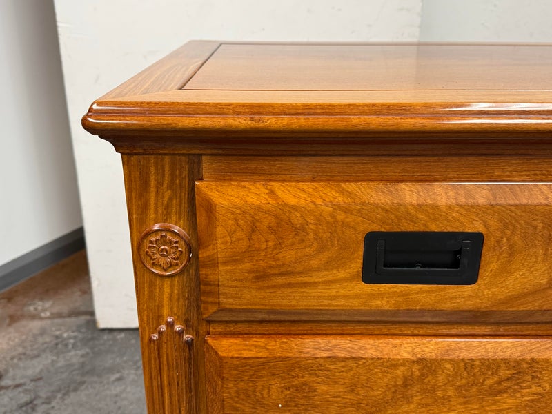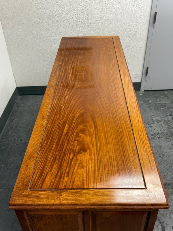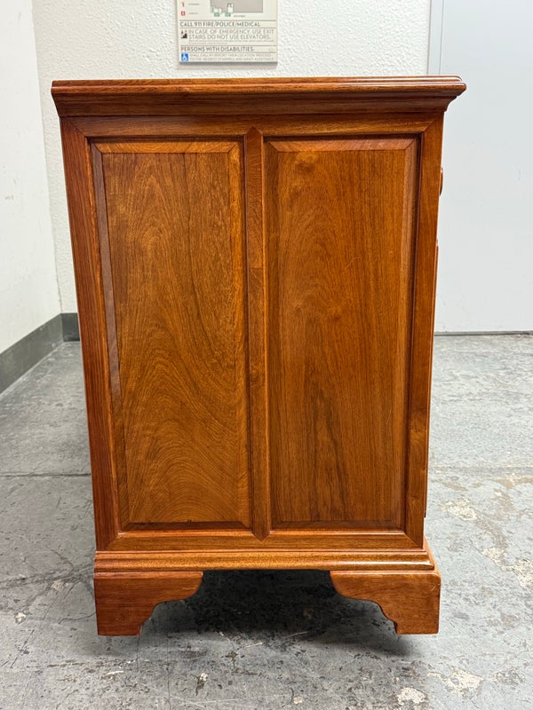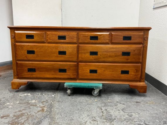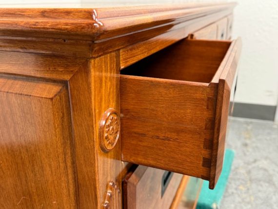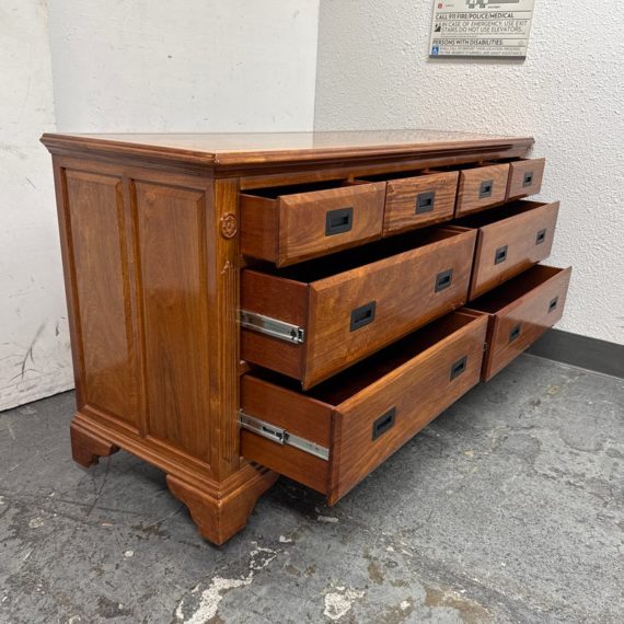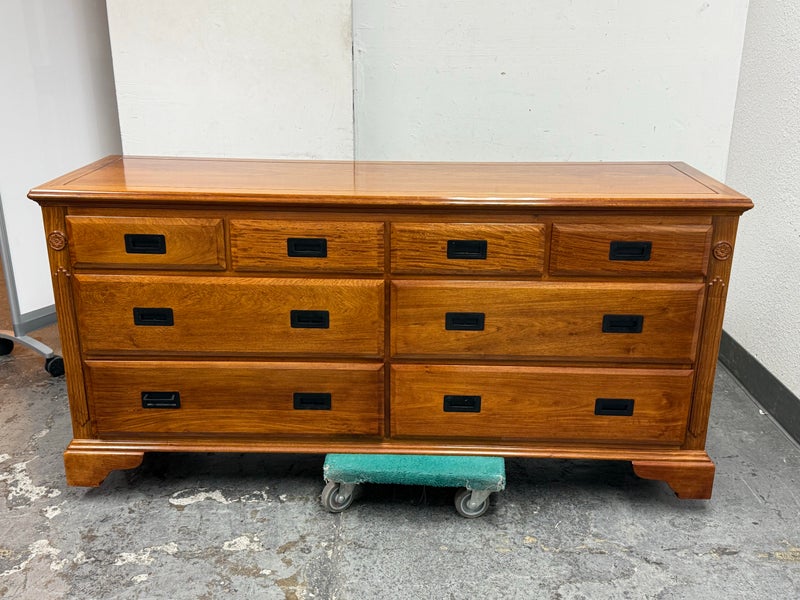 Design Plus Gallery presents an Eight Drawer Dresser of Solid Rosewood Variety of styles is established with their presence from Art Deco to Asian to Arts & Crafts with carvings that echo top craftsmanship and thoughtful design. The top row of drawers are equal width and sectioned in quarters. The bottom rows have two drawers apiece and are half width to the dresser. All original and in good condition for its vintage usage.