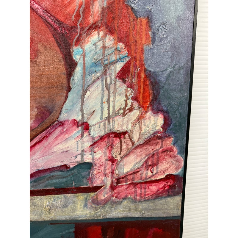 Design Plus Gallery presents an Untitled Original Painting by Sonja Bakalyal. Working in acrylic on canvas, this Abstract dynamic painting is alive with bright color, and layered textures. Signed in paint at lower right. Professionally framed in slim black wood. Good condition, minimal wear from usage.