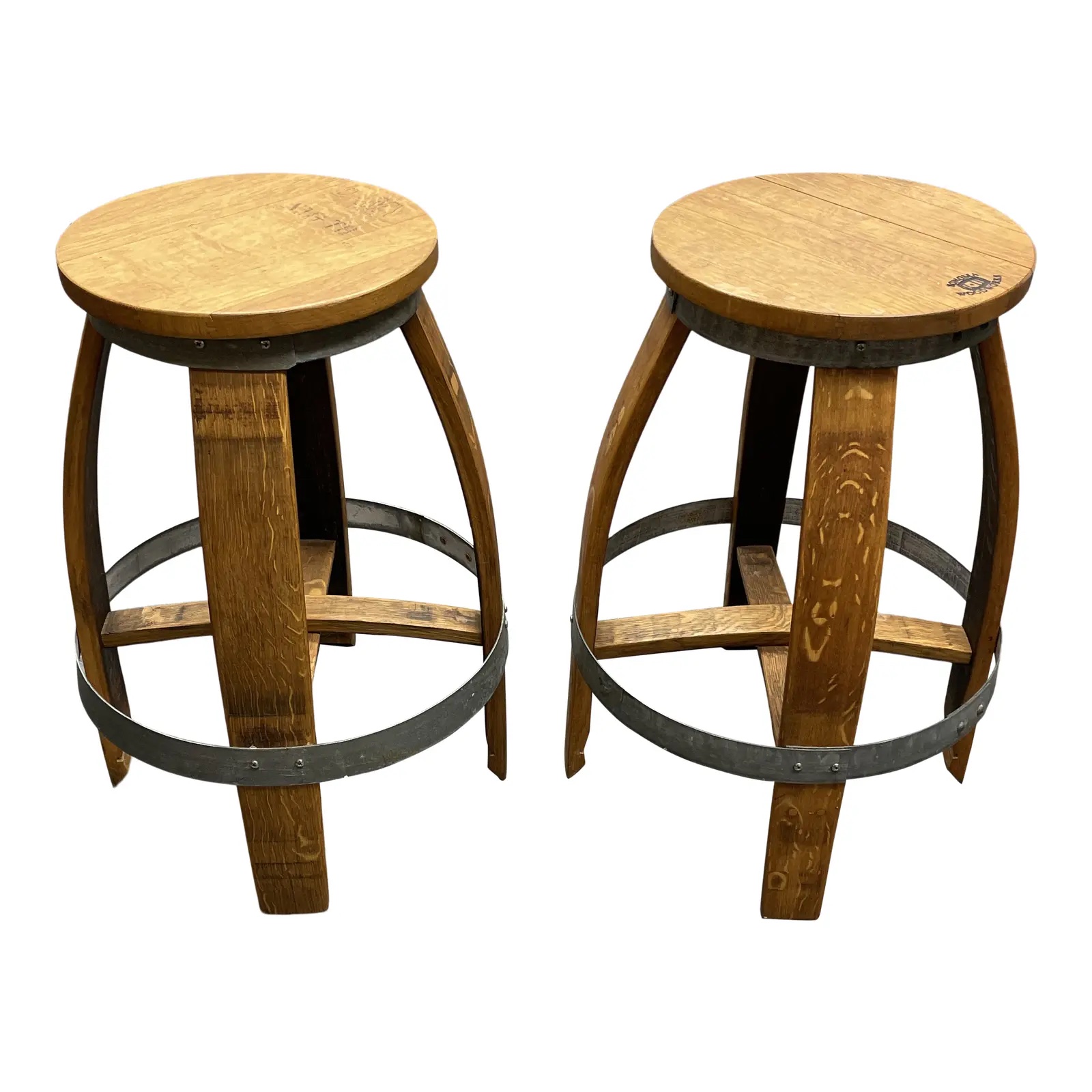 Design Plus Gallery presents a pair of Sonoma Woodworks Barrel Bar Stools. Made in Sonoma with re-purposed wine barrels. Wood is a tiger flame oak grain. Charming history adds an industrial touch with the clever footrest.