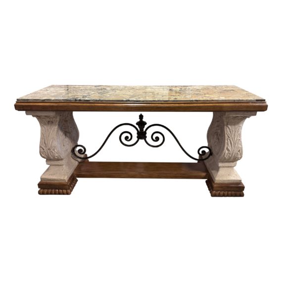 Design Plus Gallery presents a Spanish Colonial Style Tessellated Stone Console. The two acanthus-decorated pillar-form pedestals provide a classic touch, while the scald iron stretcher adds a subtle industrial flair. Raised on a beautifully carved plinth, this console is not only stylish but also sturdy and durable. The tessellated stone surface adds a luxurious feel to the piece, making it a stunning focal point in any room. This console is perfect for adding a touch of colonial charm to your home décor. In good condition with minima wear from usage + age.