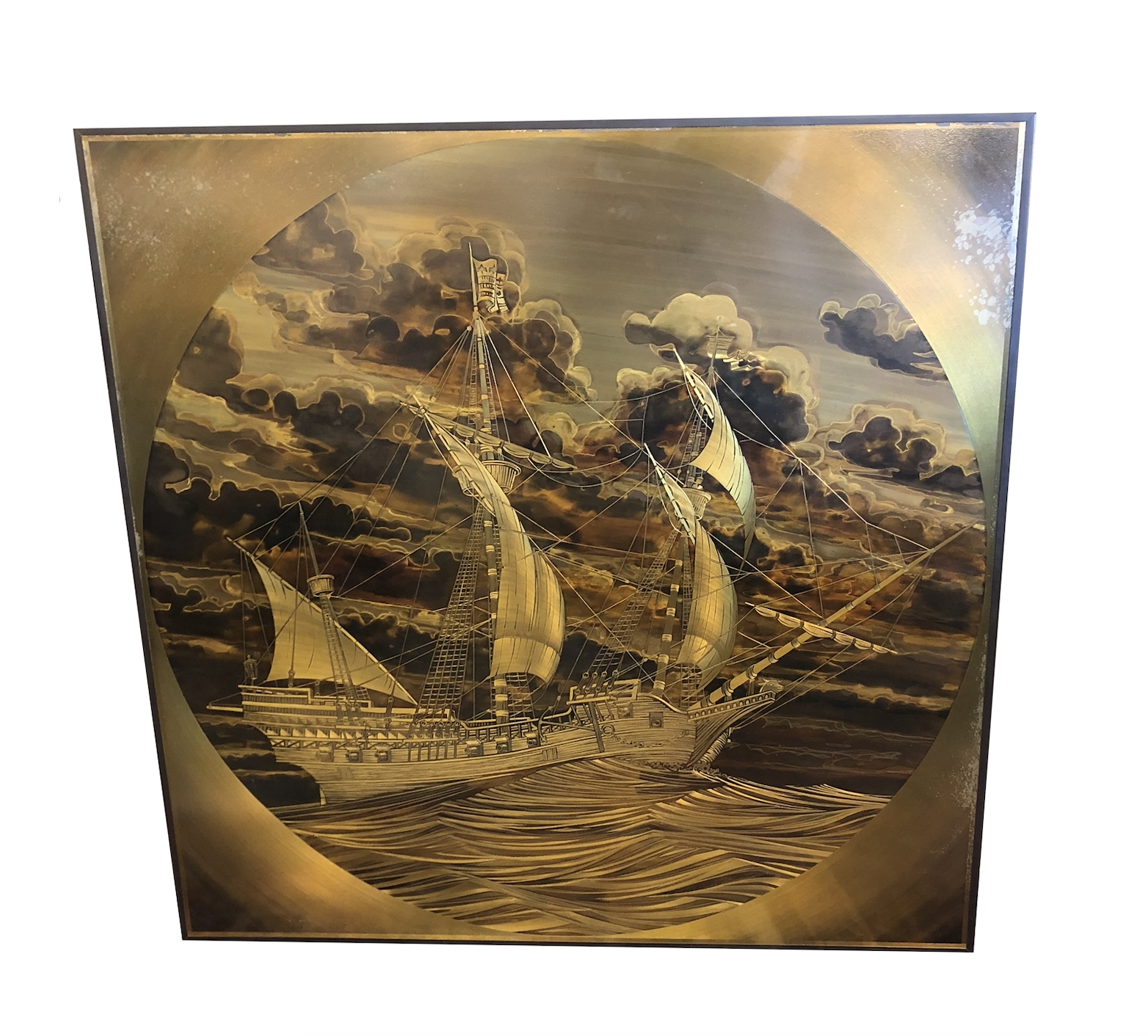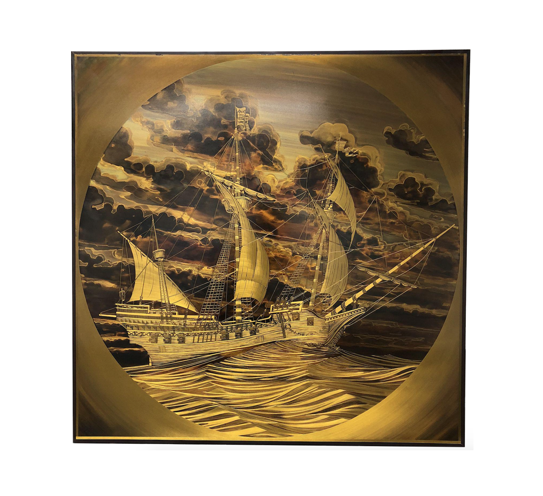 Design Plus Consignment Gallery has an original copper & brass artwork by famous artist Rudy Lechleiter. It depicts a 3-masted “Spanish Vessel” that is etched on brass & copper in unbelievable detail. It’s signed and dated “Rudy Lechleiter 1982”. The artist created only 12 of these between 1979 and 1989. No two are identical. The ship is so precisely detailed, it’s hard to believe it’s etched on metal!