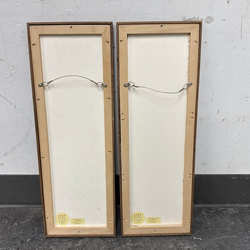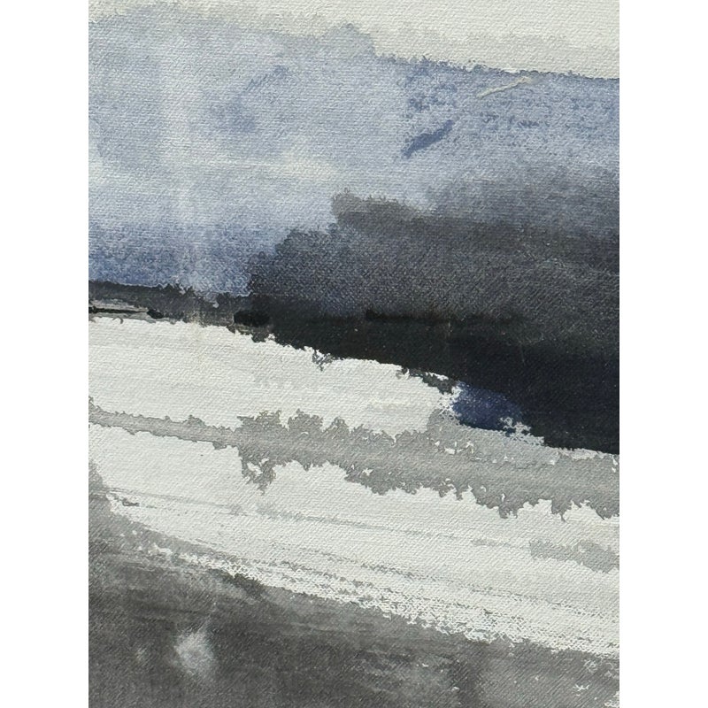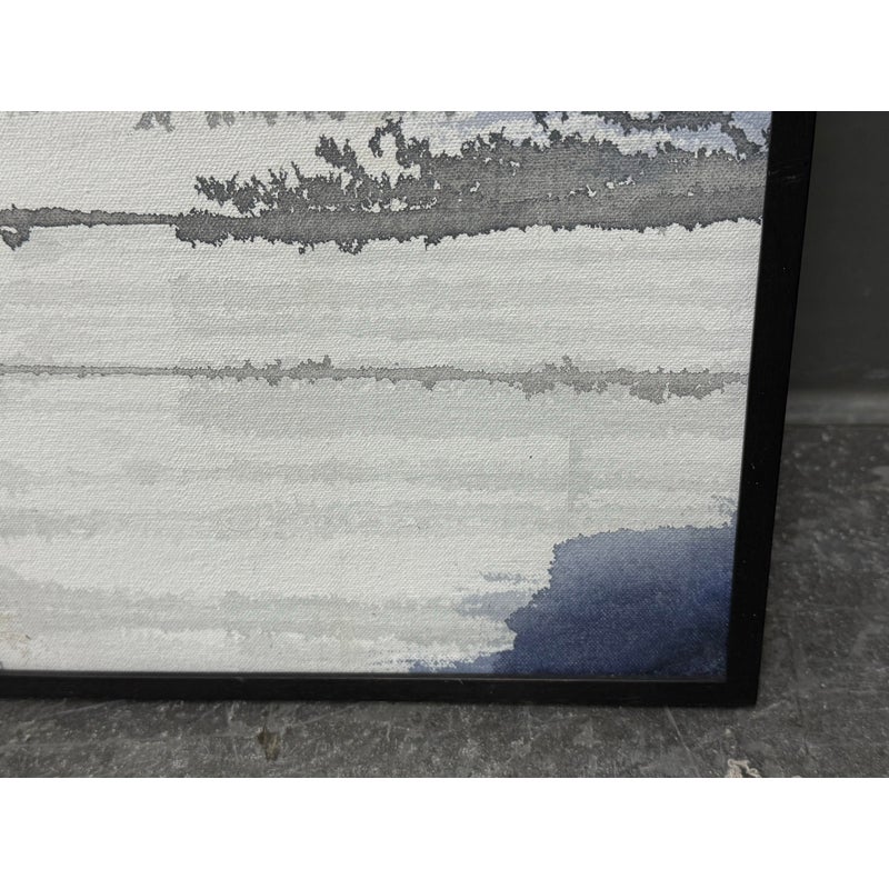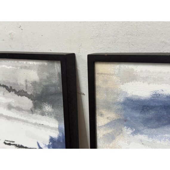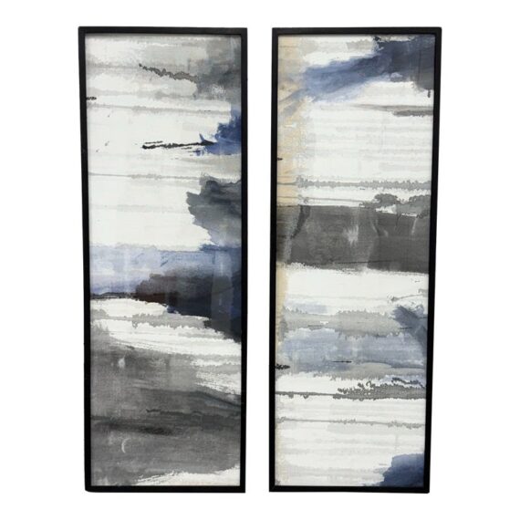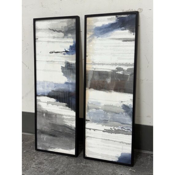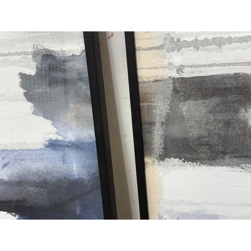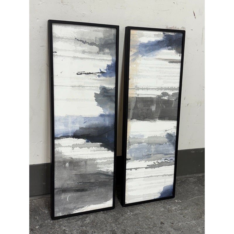 Design Plus Gallery presents a Set of Two Panels that were Custom Made from Spot Design. The abstract panels are complimentary with mostly white with the addition of blues + grays in each. A foggy night sky, is that what we can relate it to? The panels are framed by a talented group known as Spot Design. They are both in good condition for their usage with minimal surface wear.
