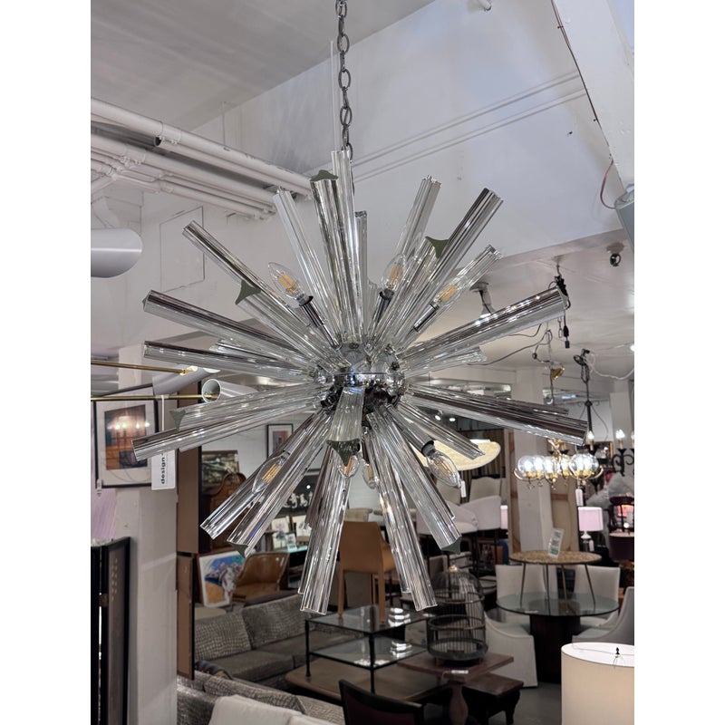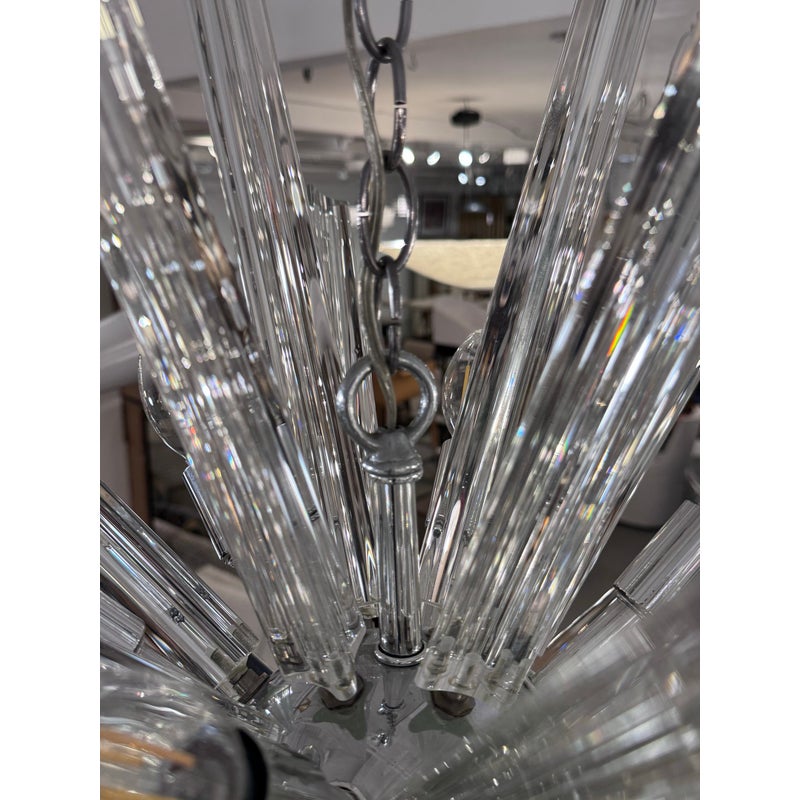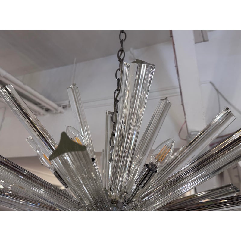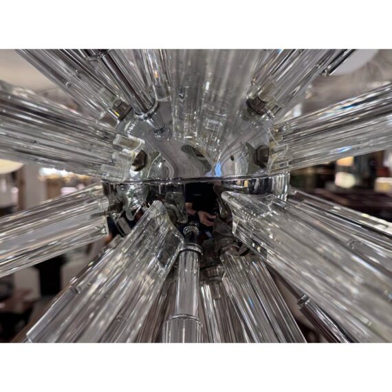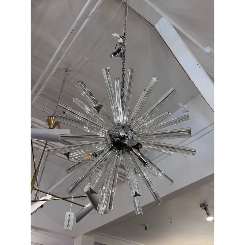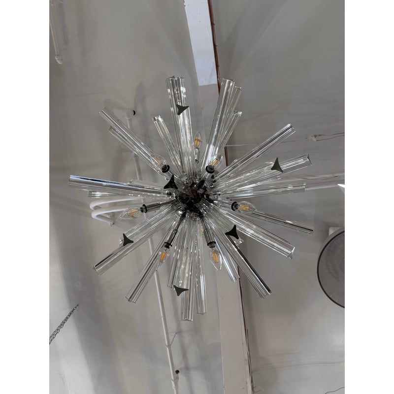 Design Plus Gallery presents a Sputnik Chandelier. A modern take on the mid-century icon, this Sputnik chandelier radiates with triedre crystal rods that catch and refract light in brilliant. Each three-sided rod extends from a sleek, polished nickel body, creating a dynamic starburst silhouette that feels both sculptural and airy. The gleaming nickel stem and low-profile canopy provide a refined counterpoint to the crystal’s crisp geometry, grounding the piece with a cool, luxurious finish. Whether centered over a dining table, punctuating a living room, or making an entrance in a foyer, the chandelier delivers drama without heaviness. Designed to impress from every angle, it’s a statement fixture that blends vintage inspiration with contemporary clarity and polish. Missing one triedre rod. In good condition, visible and minimal wear from usage. Rods are removable