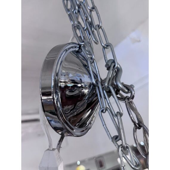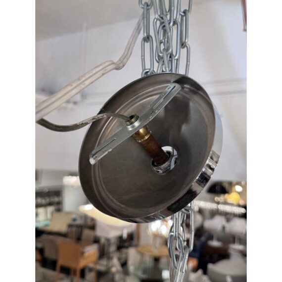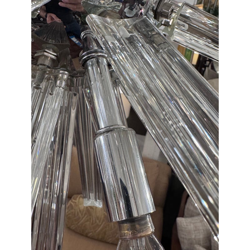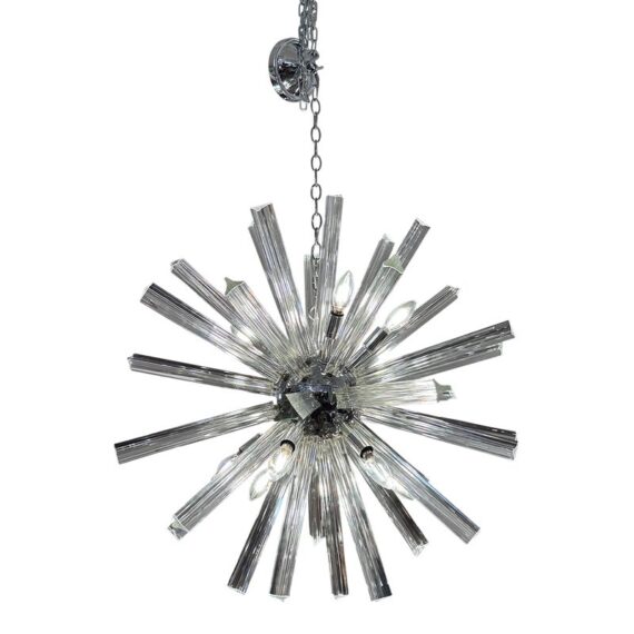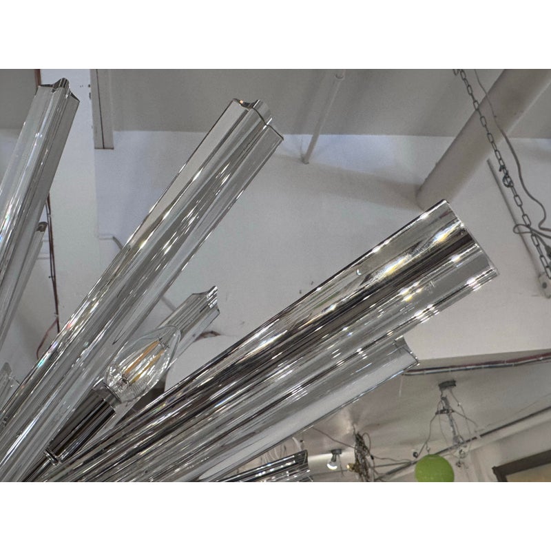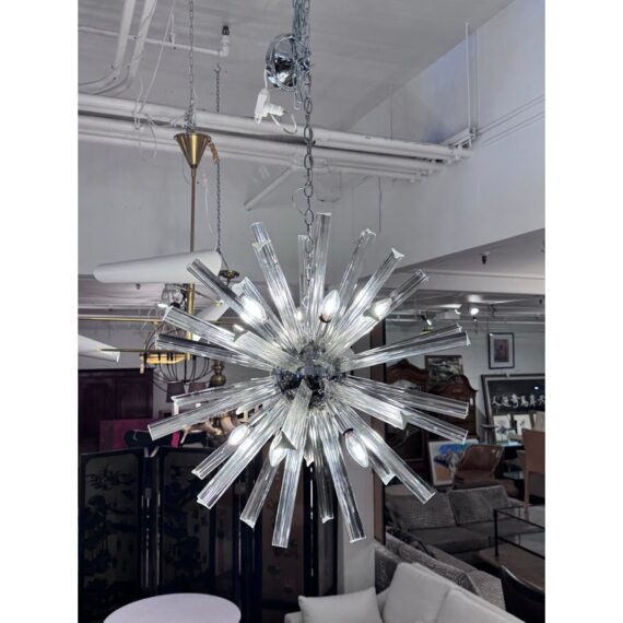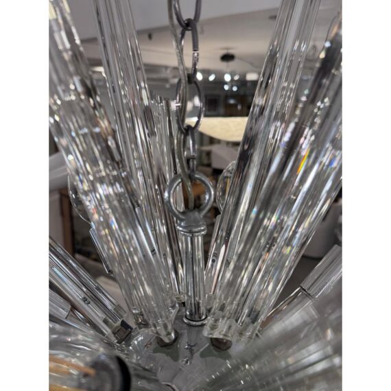 Design Plus Gallery presents a Sputnik Chandelier. A modern take on the mid-century icon, this Sputnik chandelier radiates with triedre crystal rods that catch and refract light in brilliant. Each three-sided rod extends from a sleek, polished nickel body, creating a dynamic starburst silhouette that feels both sculptural and airy. The gleaming nickel stem and low-profile canopy provide a refined counterpoint to the crystal’s crisp geometry, grounding the piece with a cool, luxurious finish. Whether centered over a dining table, punctuating a living room, or making an entrance in a foyer, the chandelier delivers drama without heaviness. Designed to impress from every angle, it’s a statement fixture that blends vintage inspiration with contemporary clarity and polish. Missing one triedre rod. In good condition, visible and minimal wear from usage. Rods are removable