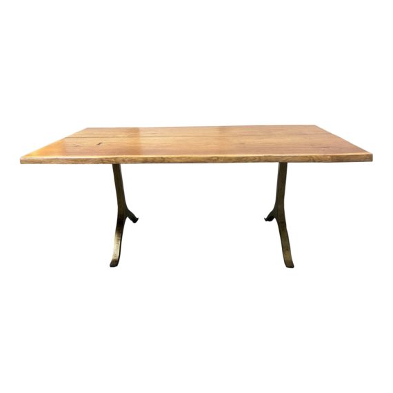 Design Plus Gallery presents the Nemus Dining Table from Anthropologie by Square Roots. Inspired by the romantic countryside of Burgundy, France. The table features French oak with a natural live edge and hand-finished contours that showcase the unique grain pattern and form of the original tree. The table is supported by graceful brass wishbone legs and includes beautiful butterfly detailing. The fumed oak finish is achieved through a signature process that dates back to the Arts & Crafts movement. This treatment creates a warm, light brown hue that enhances the wood’s natural features and storytelling. Is in good condition with wear that is consistent with its age + use.