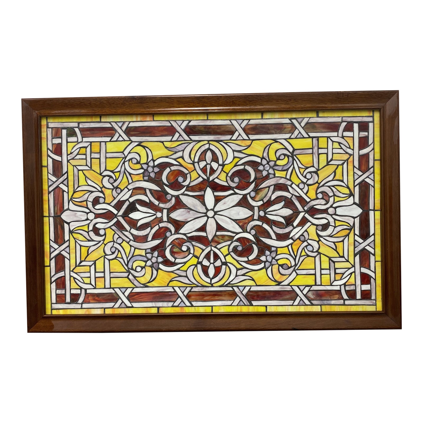 Design Plus Gallery presents am Early 20th Century Stained Glass Panel. Beautiful crafted with a floral and geometric design. Features Reds, Yellows and White cut stained glass. Framed with a solid wood in a warm finish. Metal brackets on two sides, which can hang the window panel both Horizontal and vertical. Originally from a home from San Francsico.