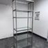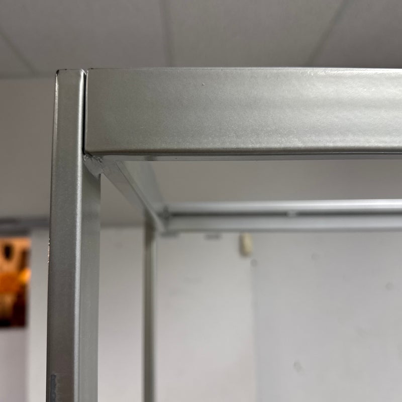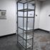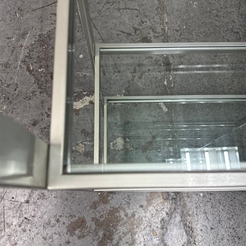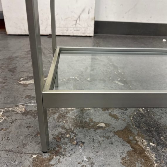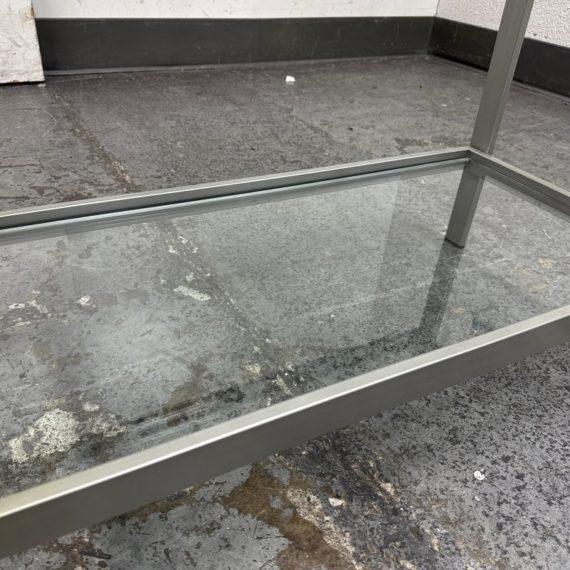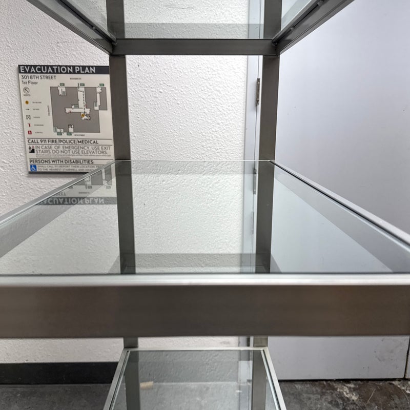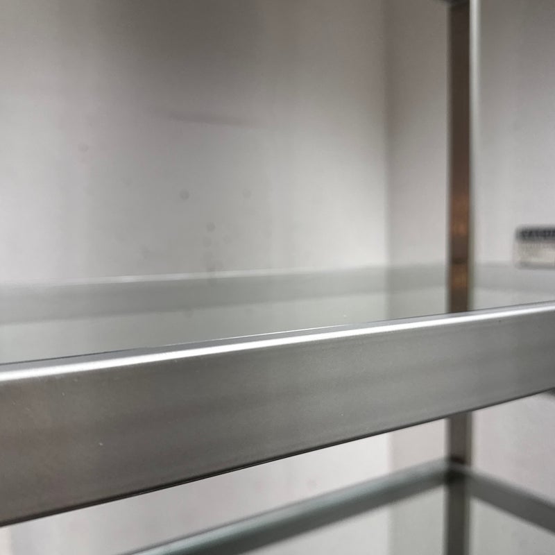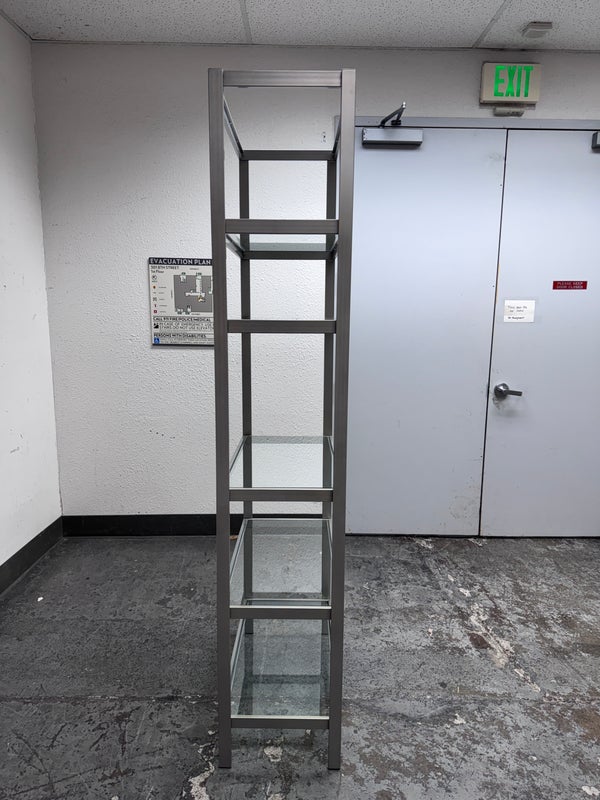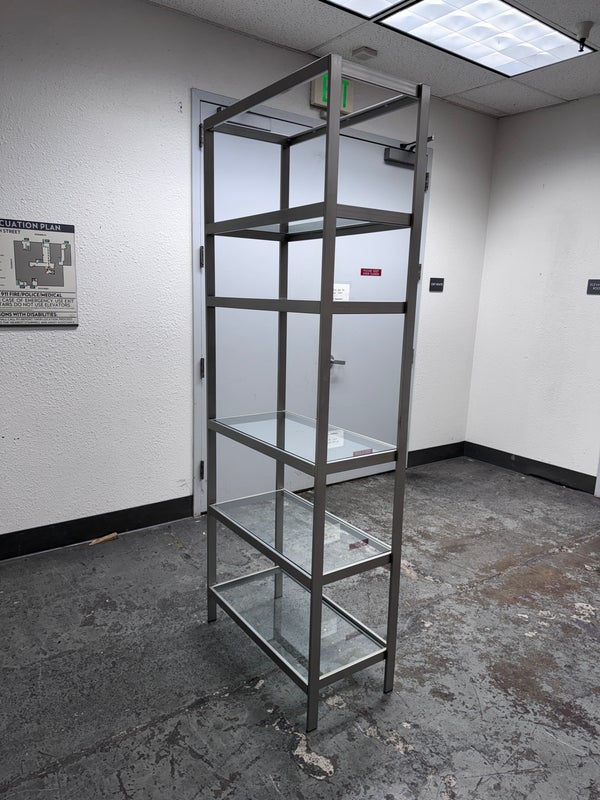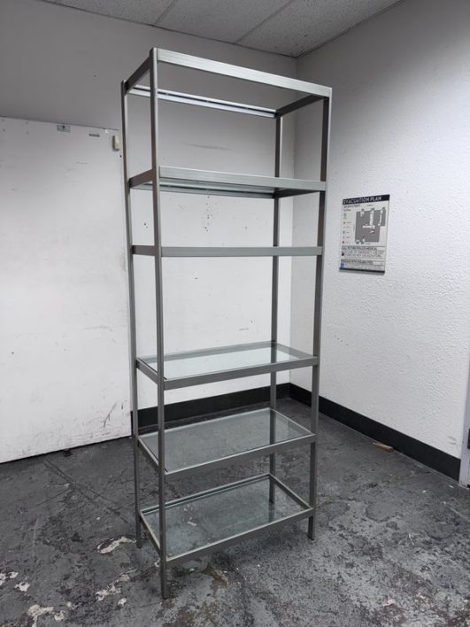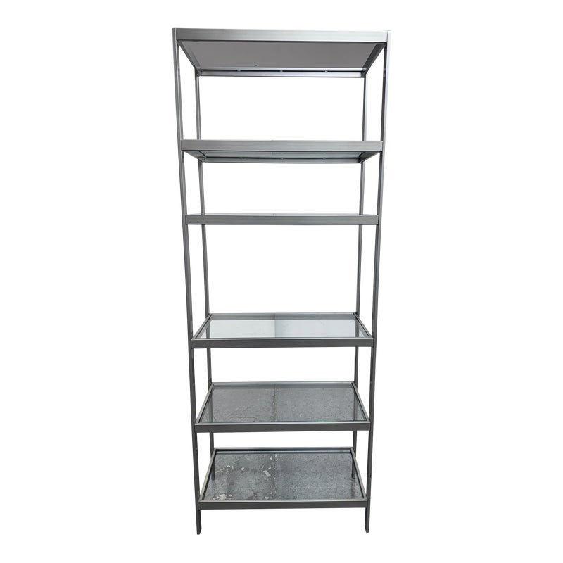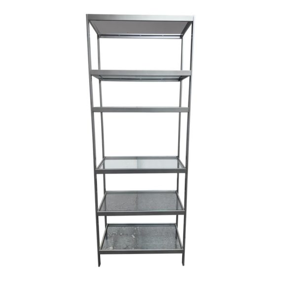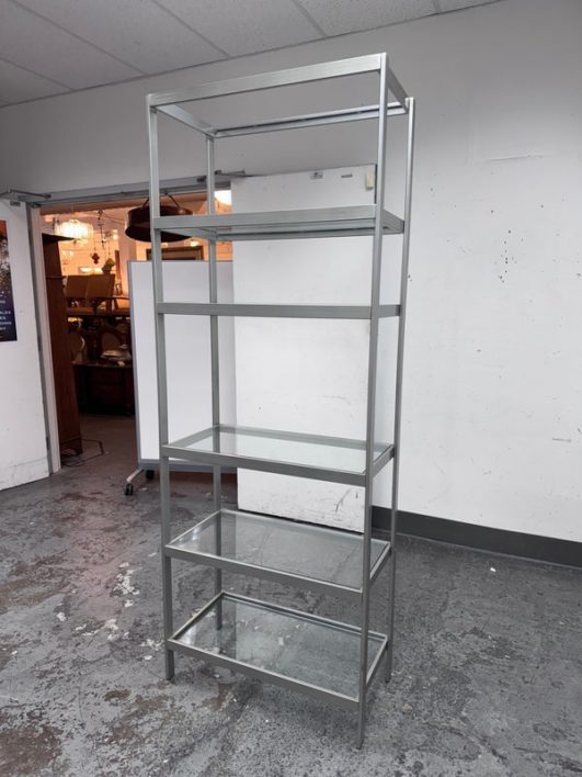 Design Plus Gallery presents a Glass Shelved Bookcase.. The frame is made of stainless steel that offers a smooth, practical and commercial friendly storage solution. The shelves are removable and tempered glass, five total. Is in good condition with minimal wear for its use + age.