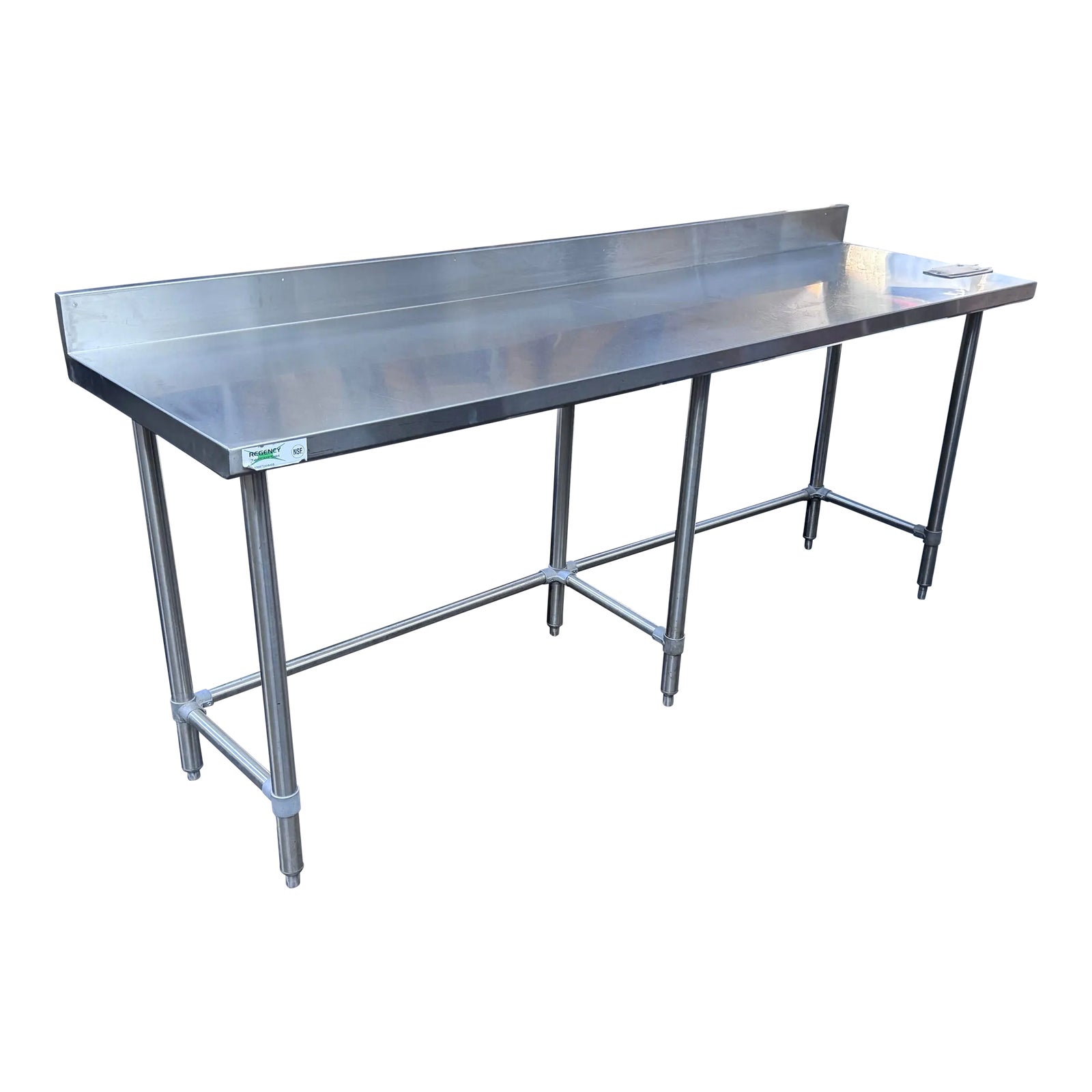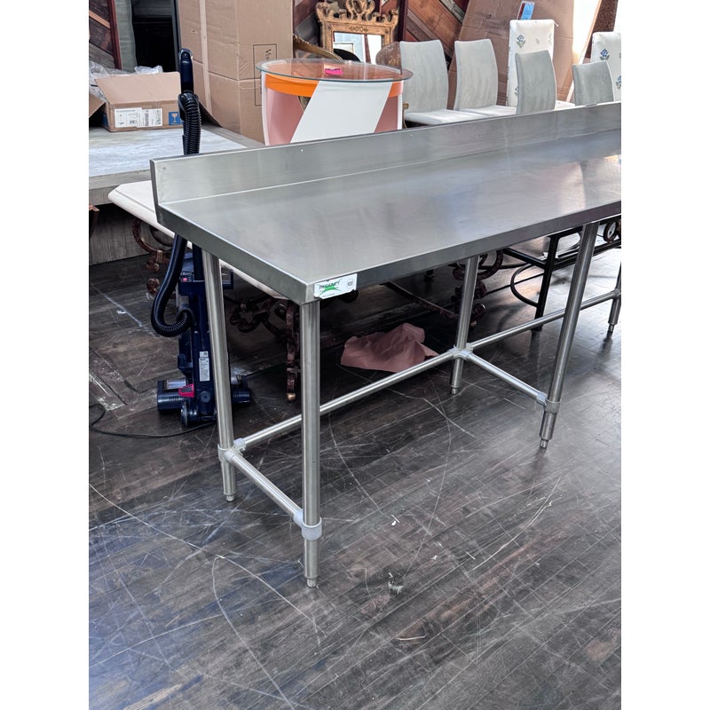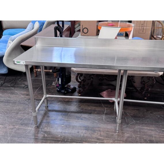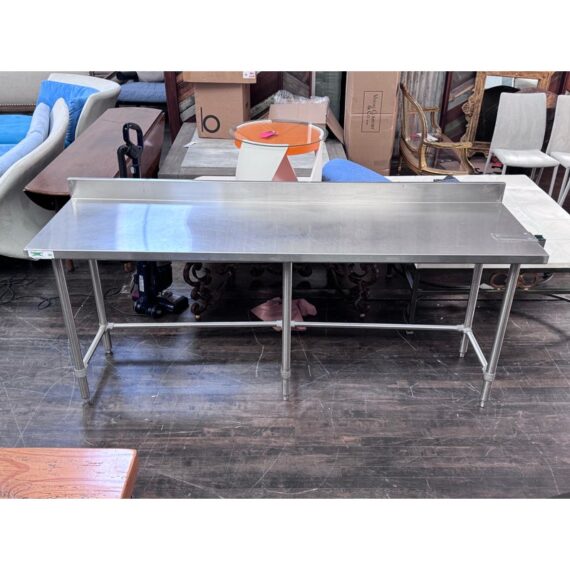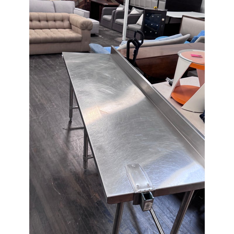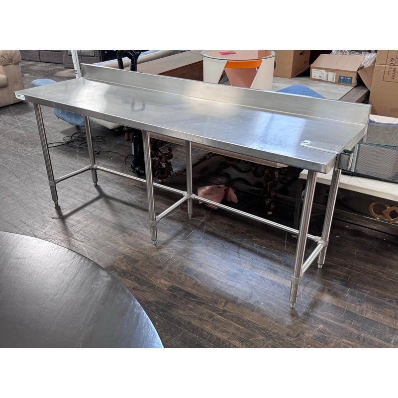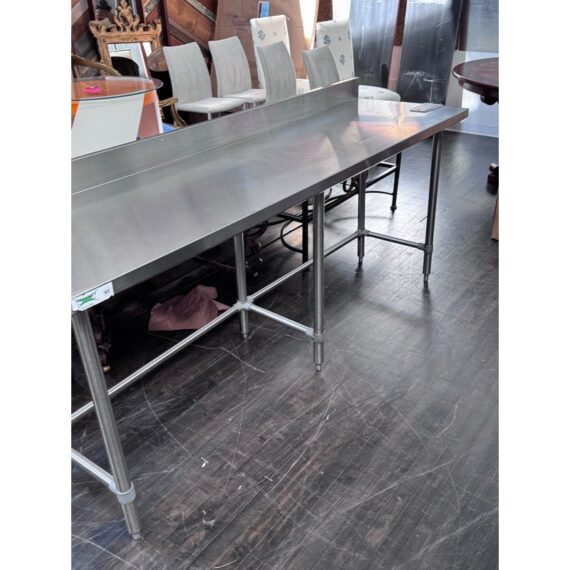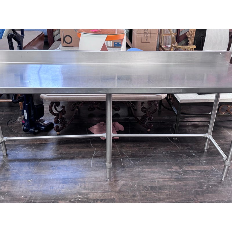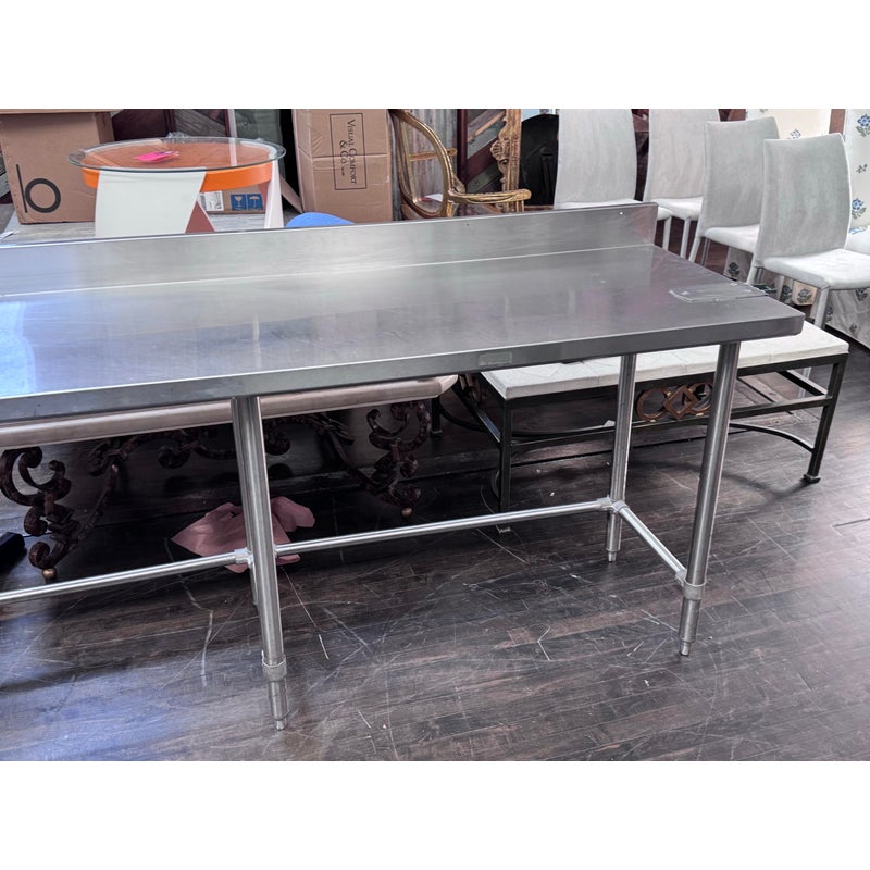 Design Plus Gallery presents a Stainless Steel Work Table. A long rectangular surface with a backsplash. The base is open for easy stools storage. In good condition, visible and minimal wear from usage.