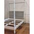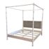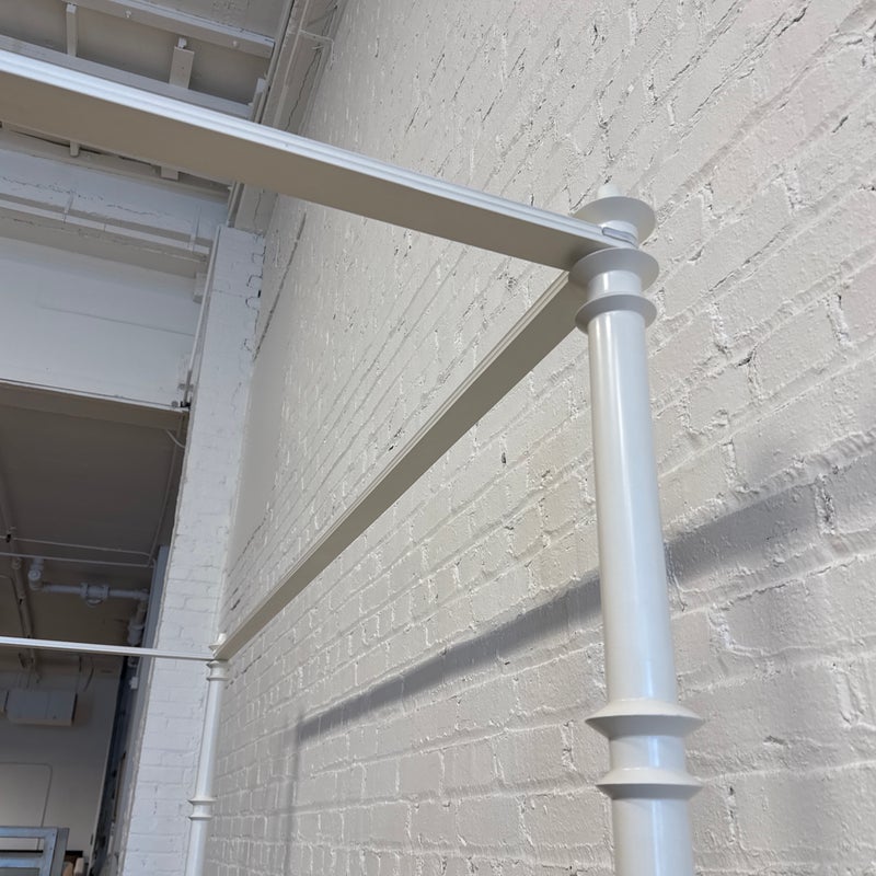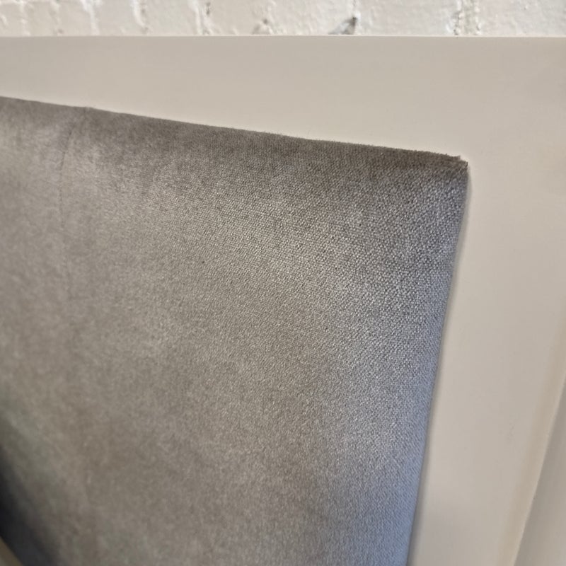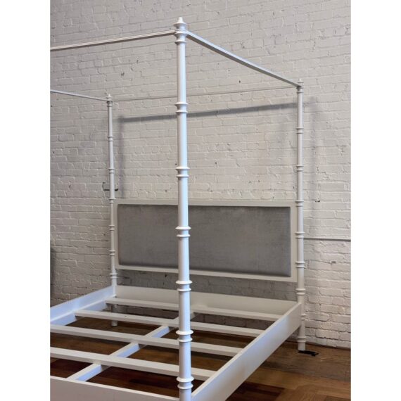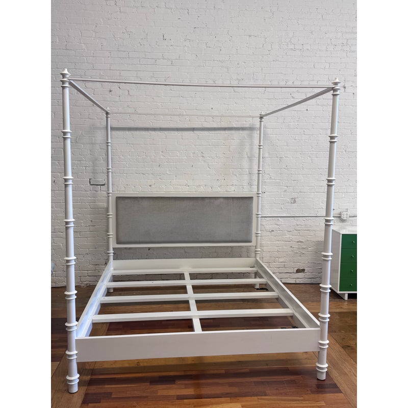 Design Plus Gallery presents a California King Size Willa Bed Frame from Oly Studio. The bed frame is a dreamy blend of timeless craftsmanship and modern comfort, the Willa Canopy Bed transforms your bedroom into a soft, elevated retreat. Its solid hardwood frame with a white enamel finish showcases exquisitely turned bedposts, subtle details that make a bold statement. The silver velvet upholstered headboard invites you to unwind in style, offering plush support wrapped in refined elegance. The frame is in good condition with minor evidence of wear for its usage. Made in the USA.