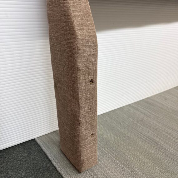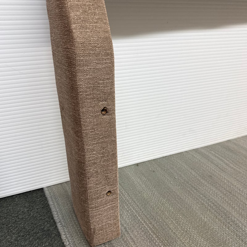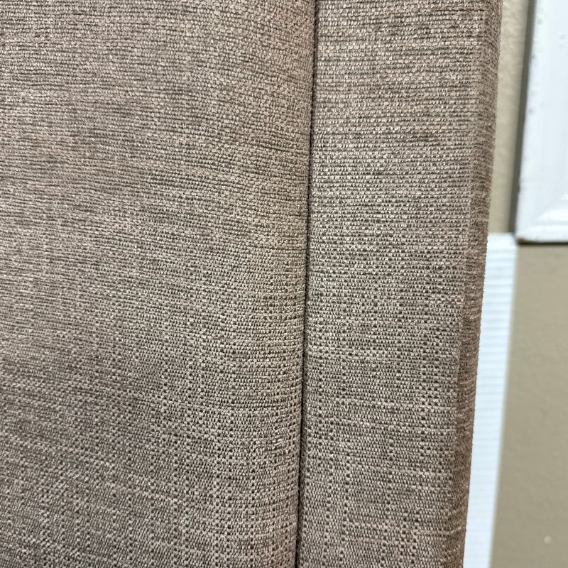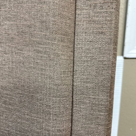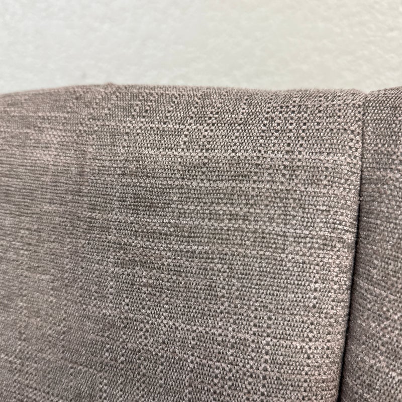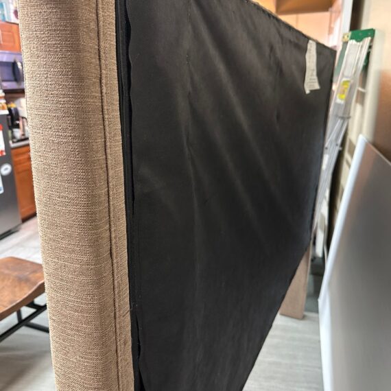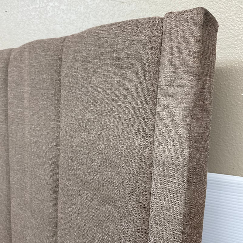 Design Plus Gallery presents a Woven Upholstered Standard King Size Bed Frame. The bed frame has a high profile that will add a nice touch to a contemporary bedroom. The woven upholstery has tones of tan, gray with off white blending into an overall taupe with texture. Its channel tufting is vertical and will allow great movement for the eye when perceiving it. It is in good overall condition with minimal wear for its usage.