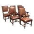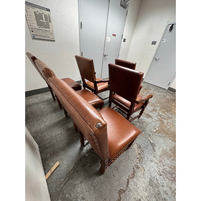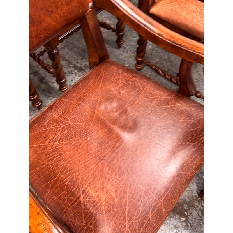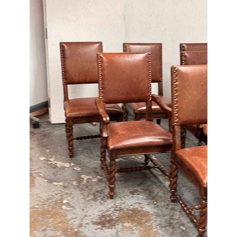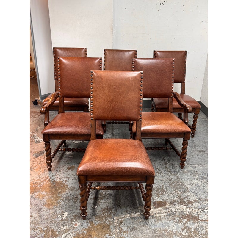 Design Plus Gallery presents a Set of Six Barley Twist Leather Dining Chairs from Stanley Furniture. The set includes two armchairs and four side chairs with barely twist legs, nailhead trim, upholstered backs and seats, and carved wood arms on the host chairs. The leather shows visible wear, including scuffs, scratches, creasing, and areas of patina consistent with age and use. This is a discontinued model from Stanley Furniture, and they are in good condition with visible and minimal wear from usage.