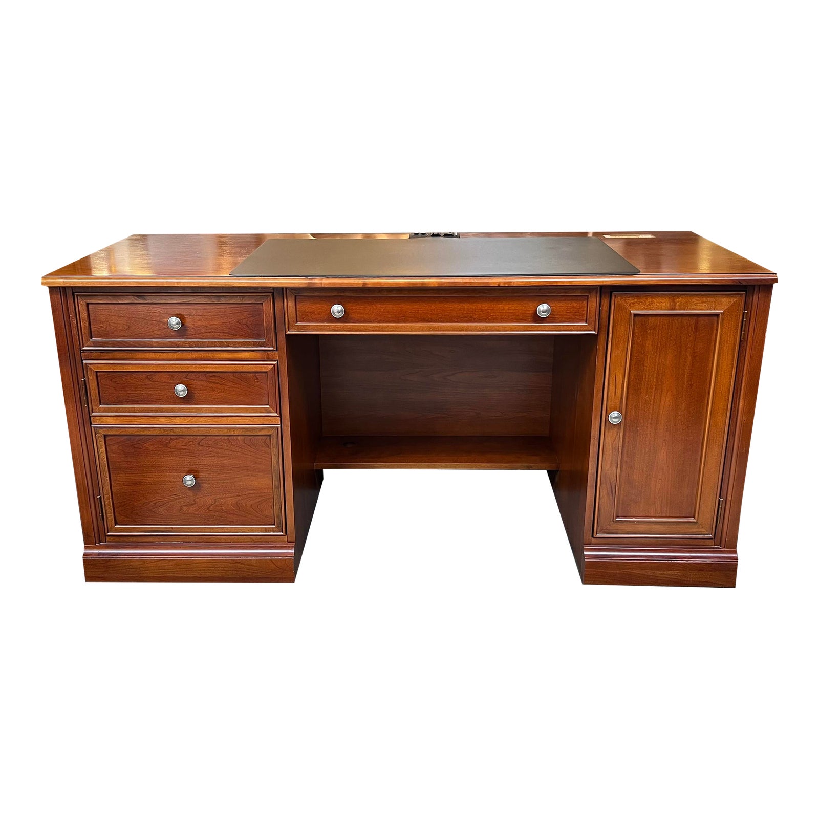 Design Plus Gallery presents an Executive Desk by Stanley Furniture. A set up for a traditional office, this executive desk has room for laptop or otherwise on top, and power strip and sliding shelves for printer behind doors. Additional shallow drawers, file drawer and keypad drawer if needed. Brass pulls. Light surface wear, mat is stuck to top, otherwise good condition.