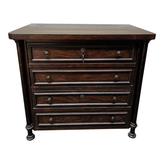 Design Plus Gallery presents a Double Lateral File by Stanley Furniture. Dark stained wood cabinet in a traditional style, masquerades as a small dresser or large nightstand. Hidden in two deep drawers with antiqued brass knobs, is storage for lateral files. Light surface wear; condition is consistent with age and use.