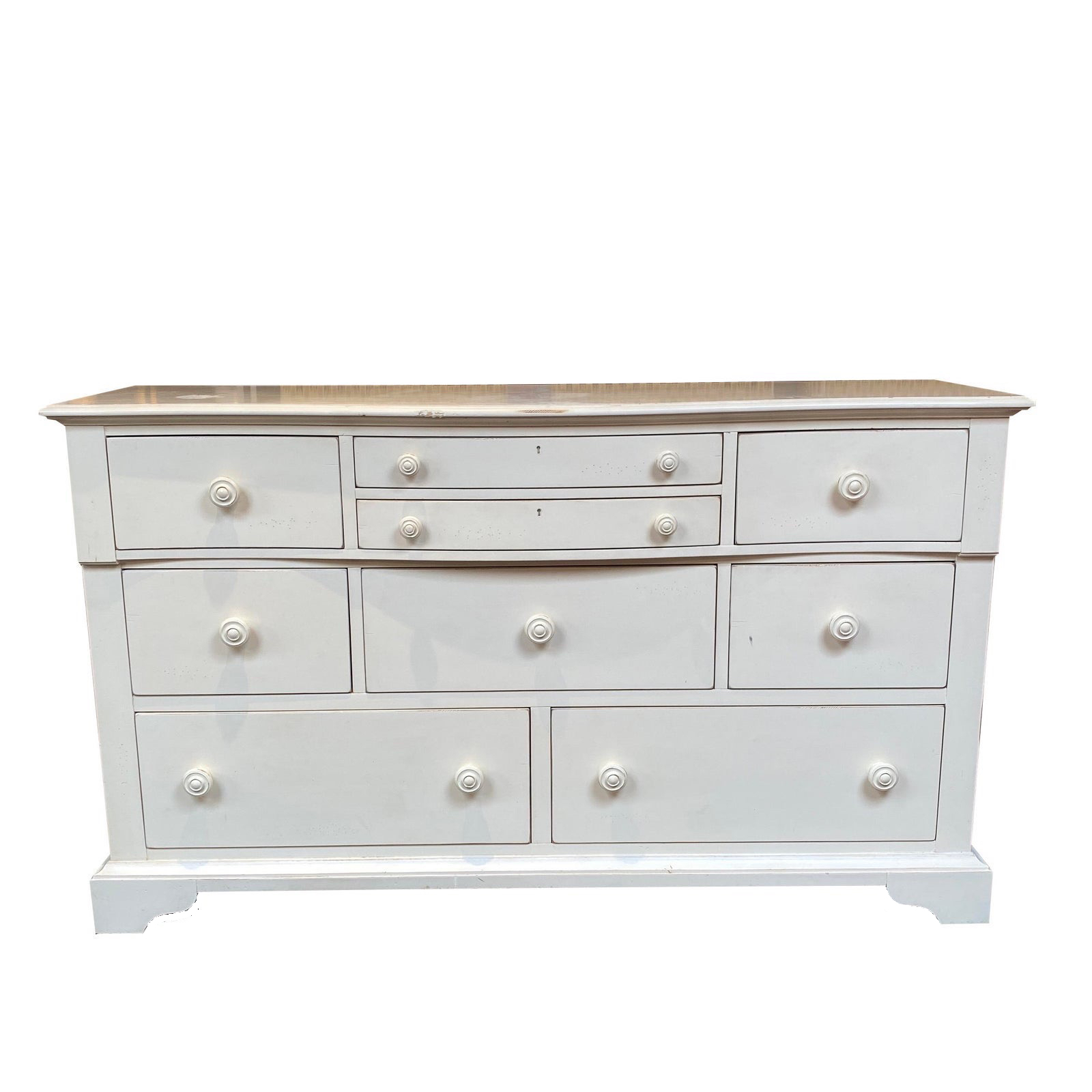 Design Plus Gallery presents a Stanley Furniture Ivory Nine Drawer Dresser. Satin ivory lacquer has been slightly distressed on the edges and antiqued. Footed base has an elegant curvature at the corners with a French country style. Three equal drawers anchor the frame with coordinating double pulls. Top graduates to a pronounced entablature for a neo-classical feel. Minor wear on surfaces. Drawers are constructed of a maple dovetail joinery (pictured.) Made in Indonesia.