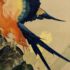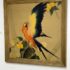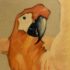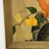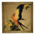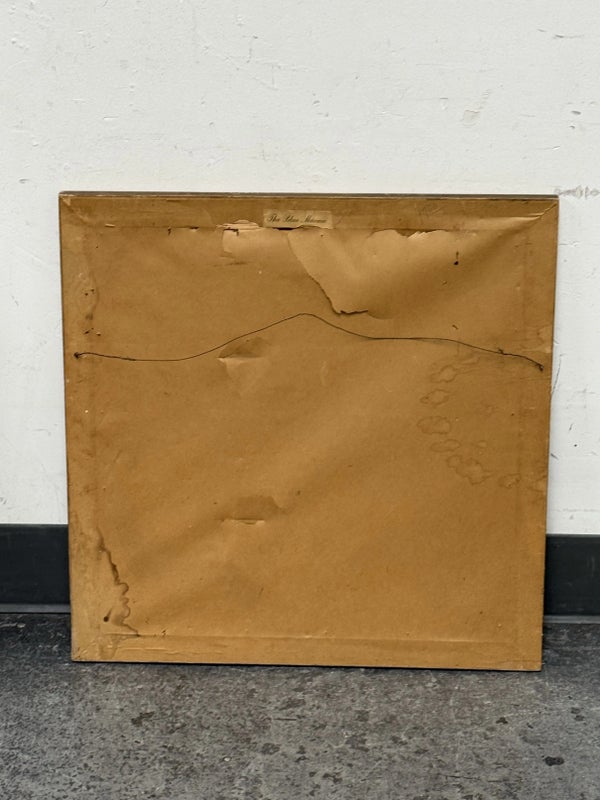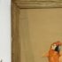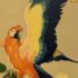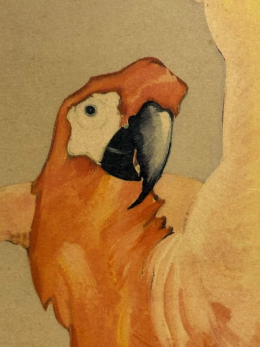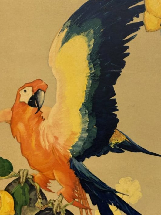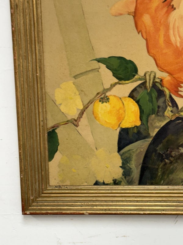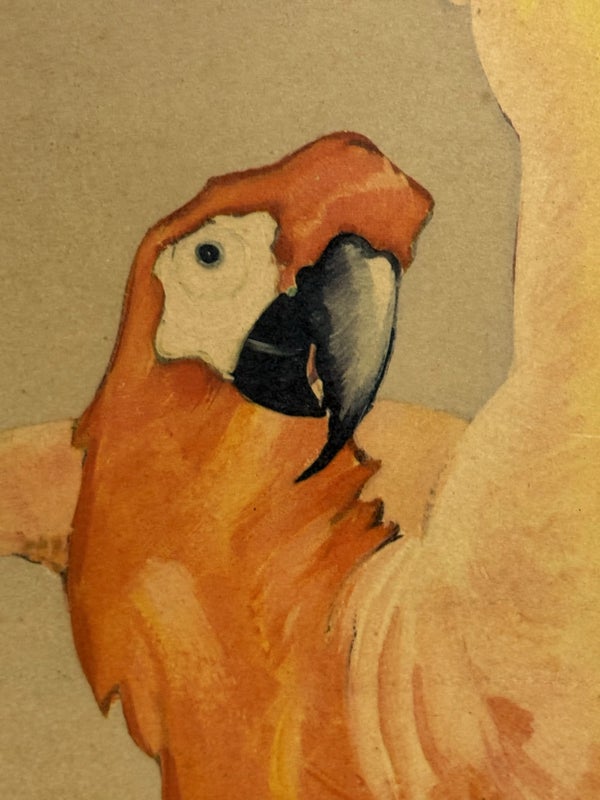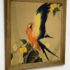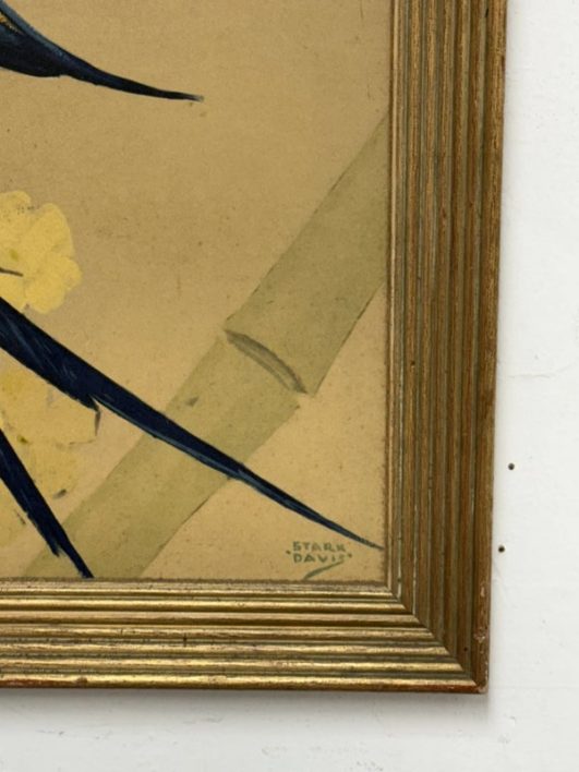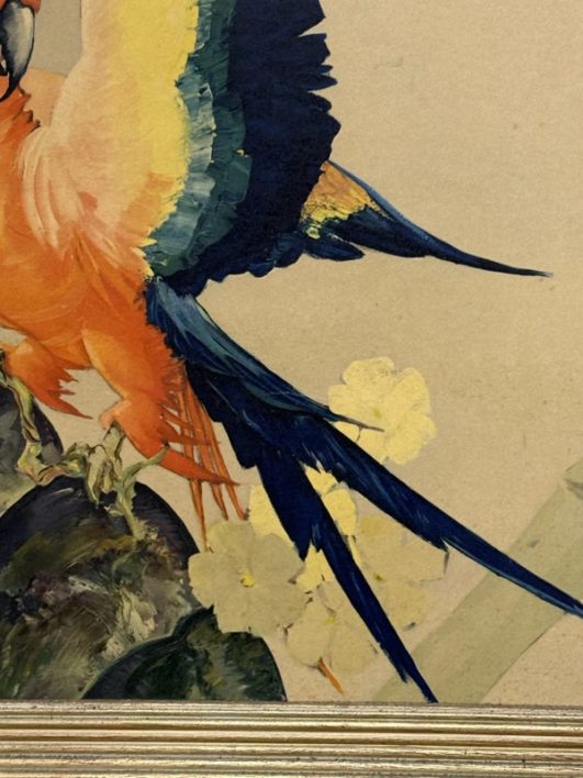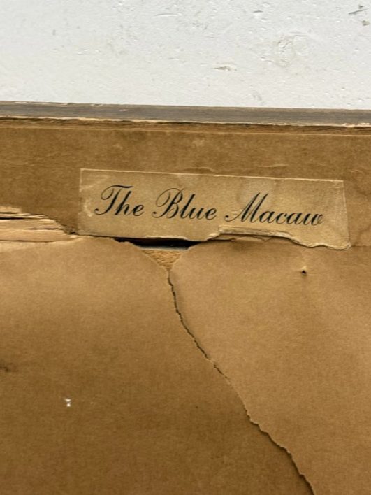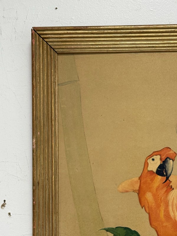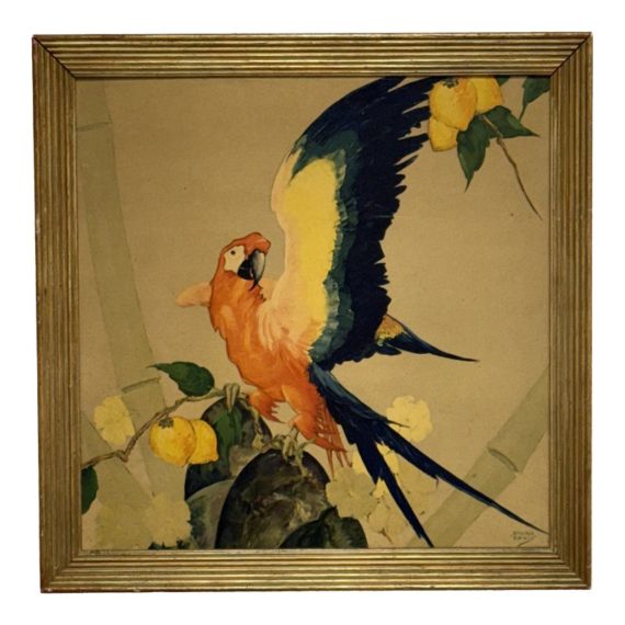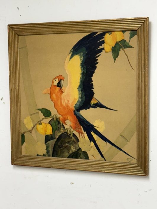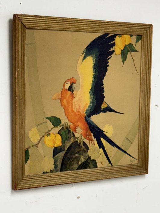 Design Plus Gallery present the Signed Print of “The Blue Macaw” by Stark Davis. This Art Deco painting print is a colorful print depicting blue feather winged Macaw with a beautiful red body standing on a flowering lemon tree. Visible wear is present on the frame and backside, oil paint deterioration has occurred with its antique age.