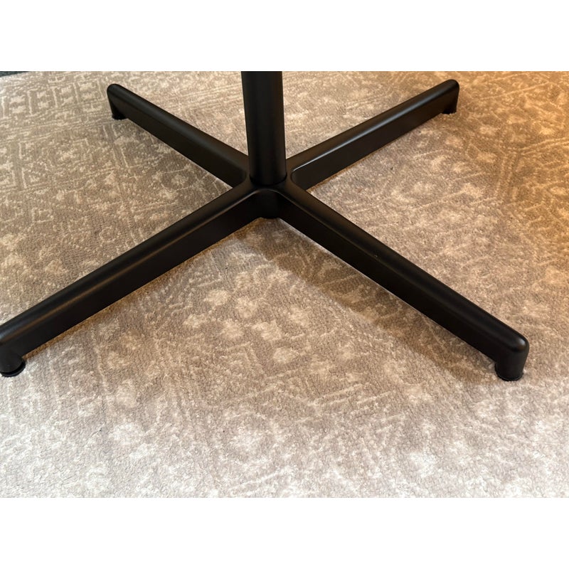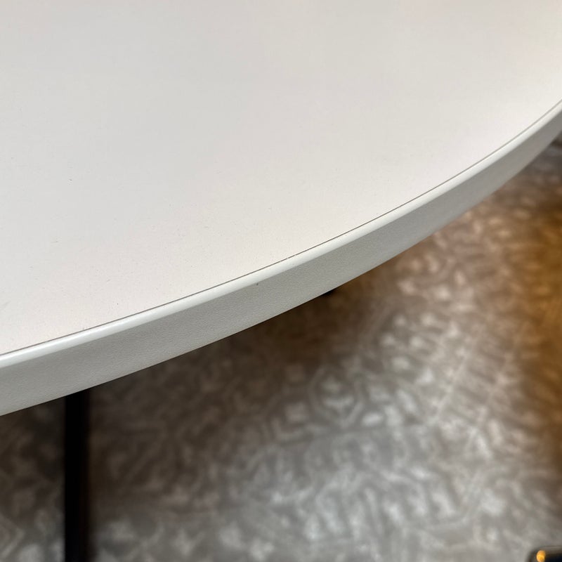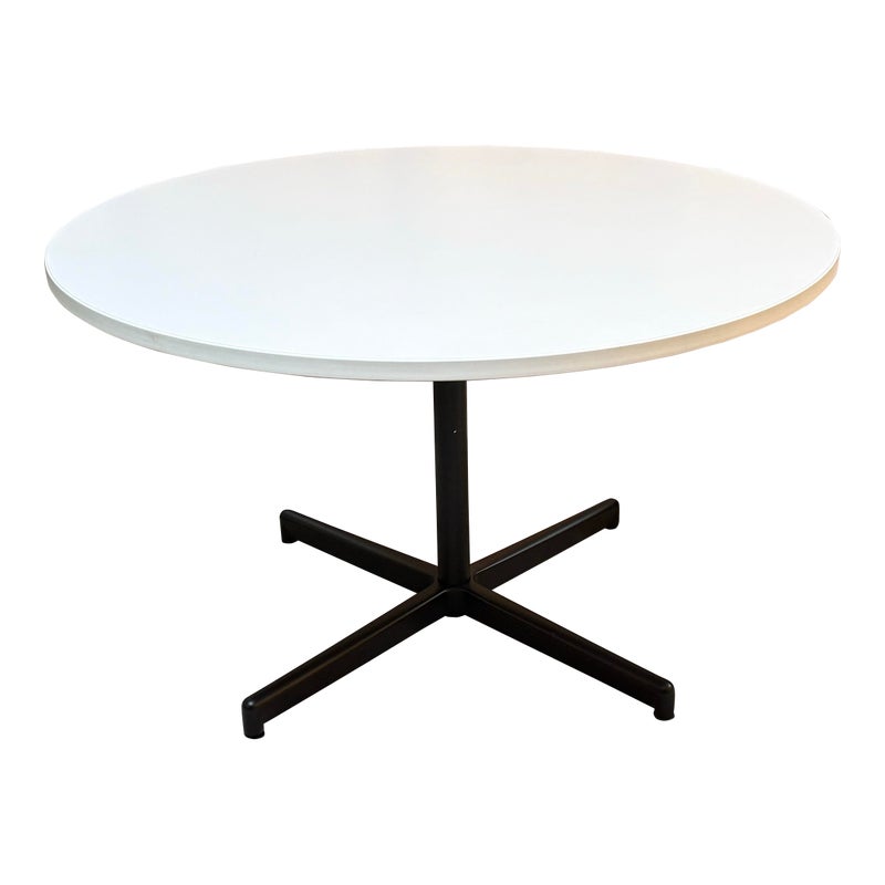 Design Plus Gallery presents a Dining or Meeting Table by Steelcase. Steelcase is a global design and thought leader in the world of work. This small table is designed to meet the non-descript work place environment. It has a round table top in white with a four post pedestal base in black. The table is no longer in production with the brand and is in good overall condition for its usage.