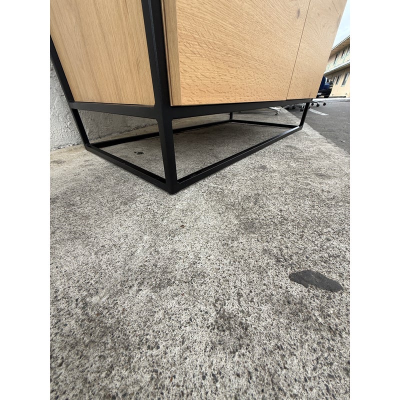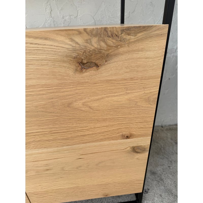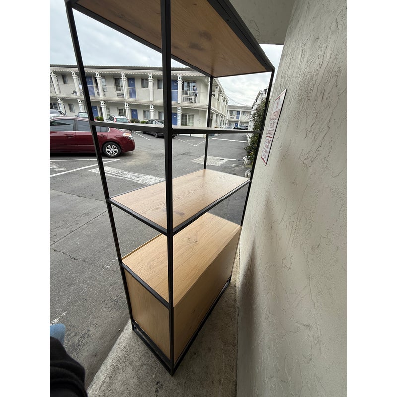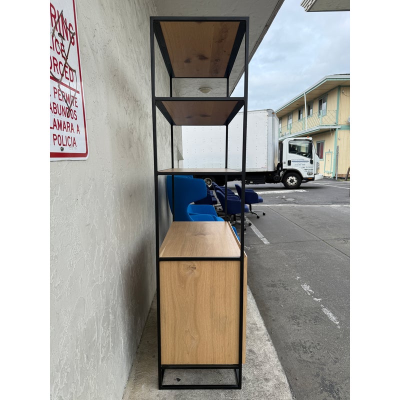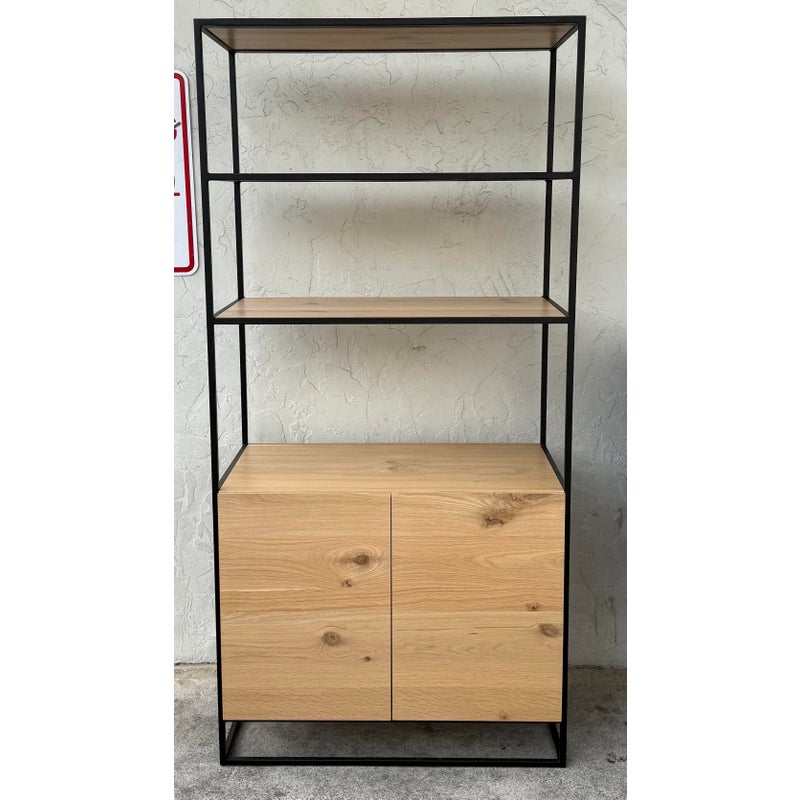 Design Plus Gallery presents Greenpoint Tall Bookcase + Storage by Steelcase for West Elm. Open shelving provides room for books, art, and everyday objects, while the lower cabinet offers discreet storage behind clean-lined doors. The case is finished in Natural Oak wood, showcasing organic grain variation that adds visual interest without overpowering a space. The frame is in a dark bronze tone that creates a strong architectural outline and provides stable support, giving the bookcase a grounded, modern presence. This Greenpoint bookcase blends residential style with contract-level durability, offering versatility and long-term usability in a streamlined form. In good condition, visible and minimal wear from usage.