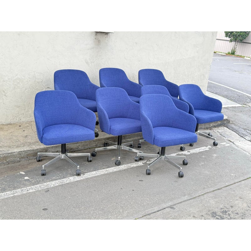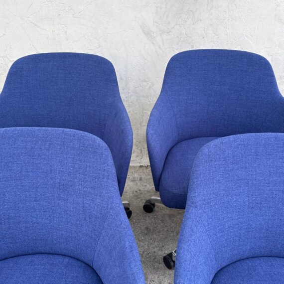 Design Plus Gallery presents a Set of Four Sterling Conference Office Chairs by Steelcase for West Elm. With a timeless design and 50s-inspired details, the West Elm Work Sterling Chair brings a mid-century aesthetic to any home while offering various finishes for personalized expression. So comfortable and easy to add into your home, bedroom, or even dining room if you are so inclined but these chairs are practical for a meeting room in an office. They are in good condition with wear that is consistent with minimal usage.
