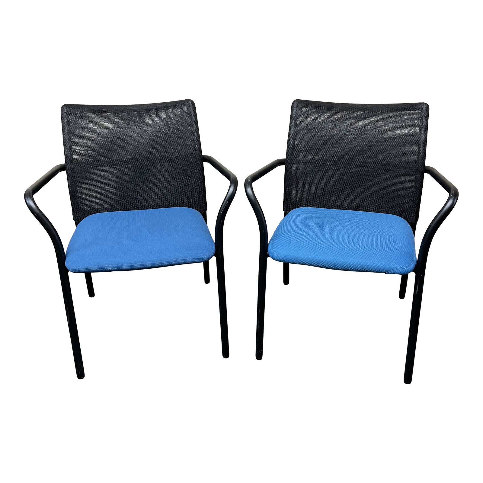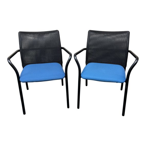 Design Plus Gallery presents a pair of Jersey Arm Chairs by Steelcase. Perfect for that extra seat next to desk or workstation, the contemporary chair is a comfortable guest chair. Cushioned blue seat and black mesh back is elevated on black powder coated tubular steel frame. Lightweight and stackable.
