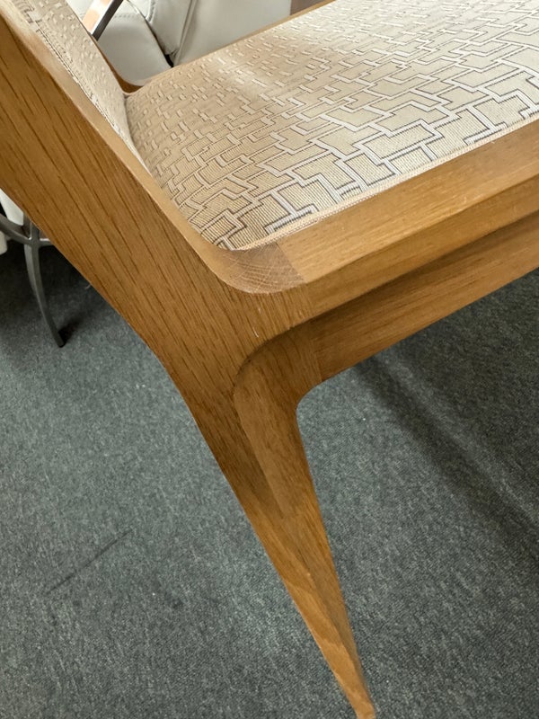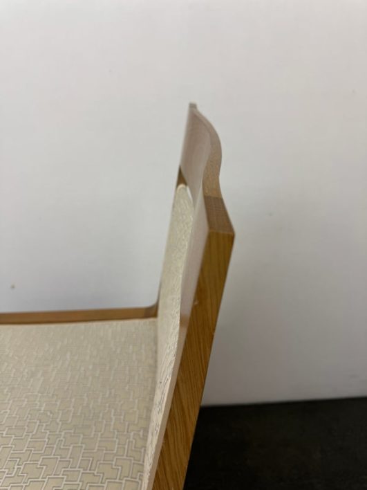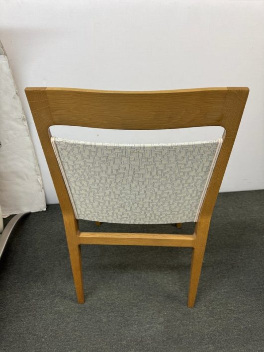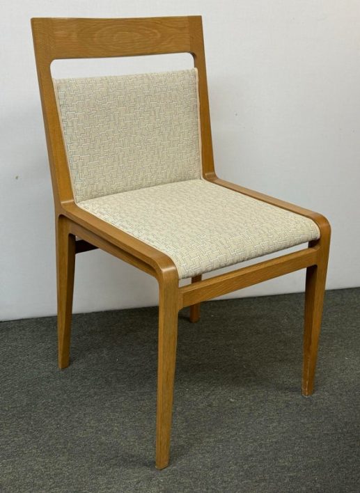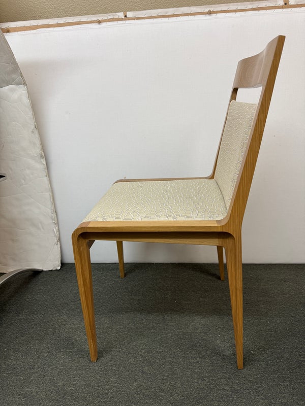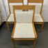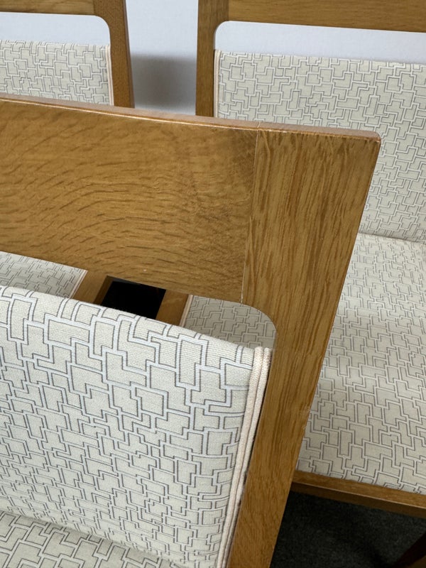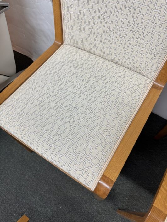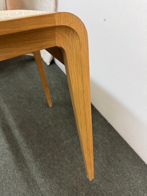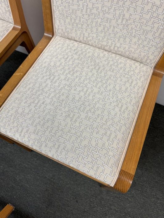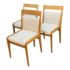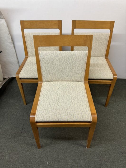 Design Plus Gallery presents a Set of Three Maple Finish Dining Chairs from Roche Bobois. Designed by Stephane Lebrun, the three chairs are made of solid oak wood with a water based varnish. The print is light to the off white background on their upholstery. Very nice, mid-century space age modern. Still in good condition for their near vintage age.