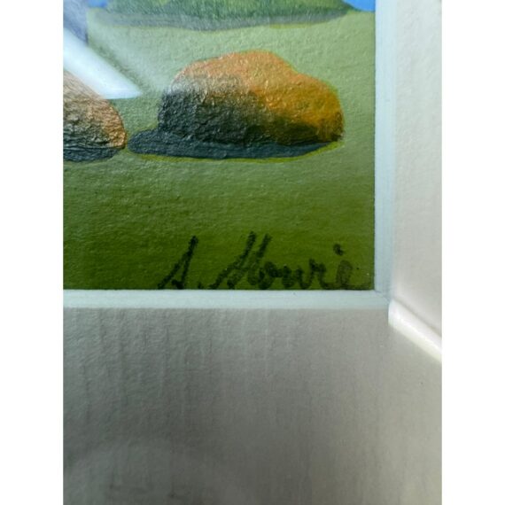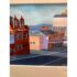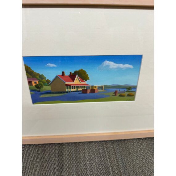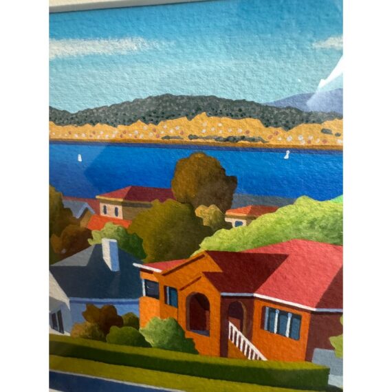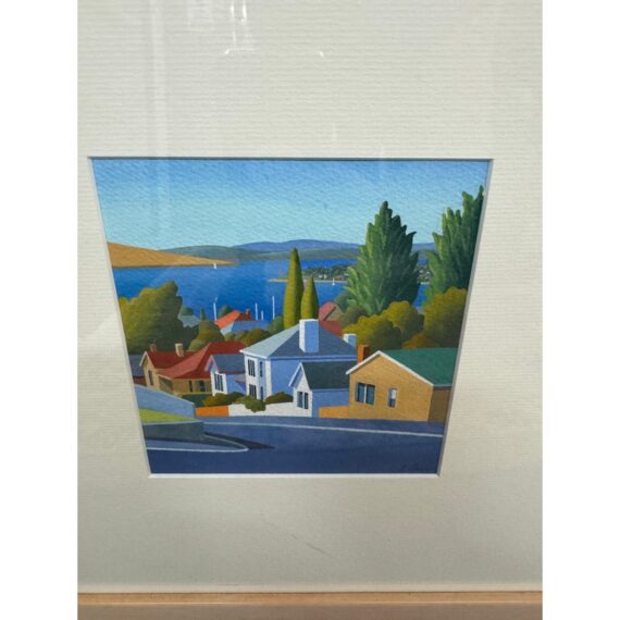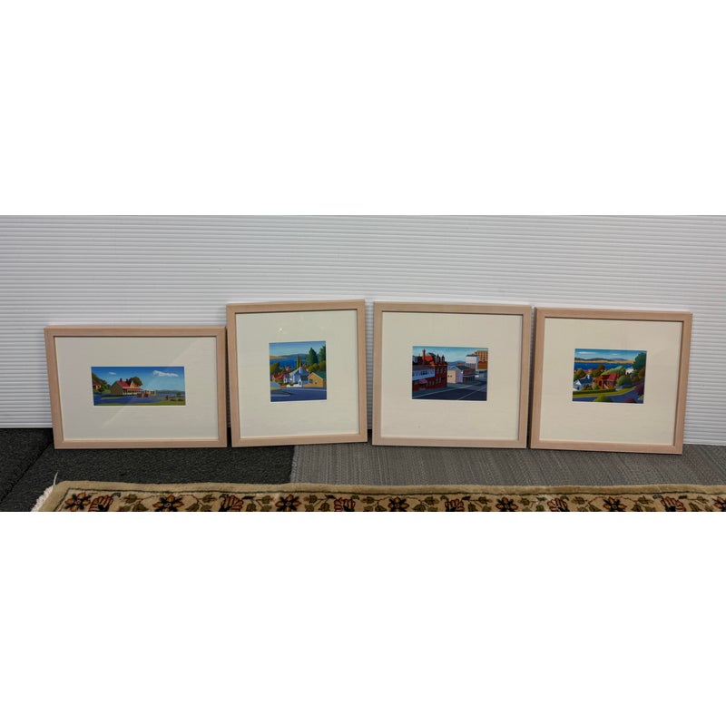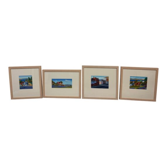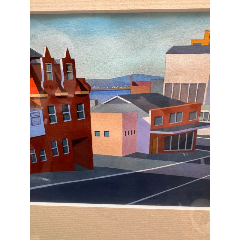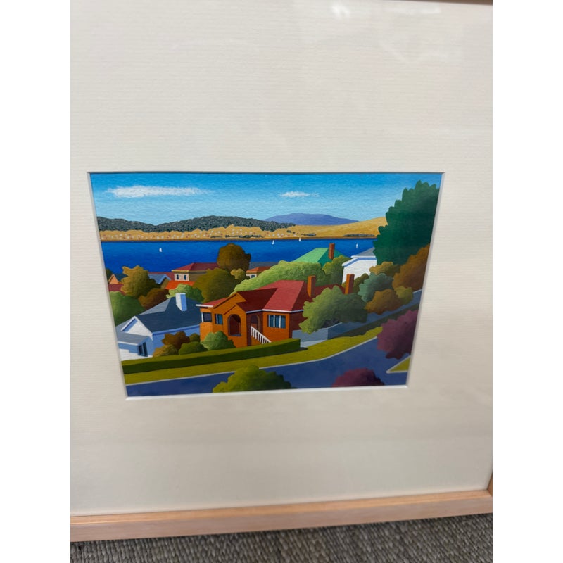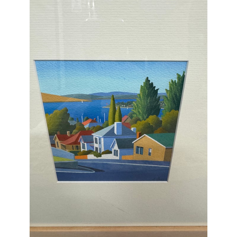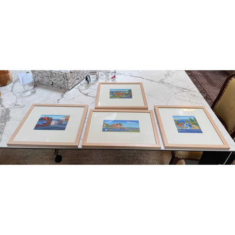 Design Plus Galley presents a Set of Four Original Tasmania Landscape Artworks by Steve Howie. Howie is a Tasmanian-based painter known for his vibrant, naturalistic urban landscapes of Hobart and surrounding areas. These individual works are a distinctive blend of geometric, man-made structures and created with acrylics on paper or oil on canvas. The landmarks the pieces represent in Tasmania are Regatta Place, Quail Street, Valley Street, and Campbell Street. They are all differing sizes with complimentary scenes and matching wood tone on framing. They are all in good condition for their usage.