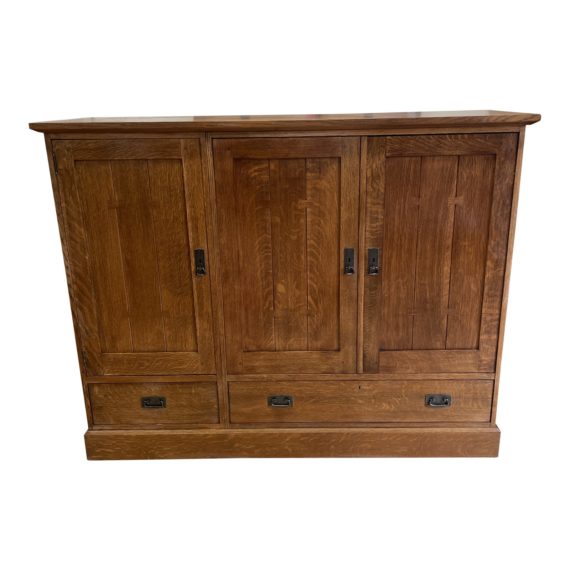 Design Plus Gallery presents a Stickely Furniture Entertainment Center. Quarter sawn oak is beautifully showcased in this practical media unit. Cabinet doors open and slide back into the depth of the unit for convenience. Doors and drawers bellow are adorned with Stickley’s classic oiled brass pull hardware. Visible wear through out, unit is in good condition. Hand crafted in New York.