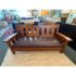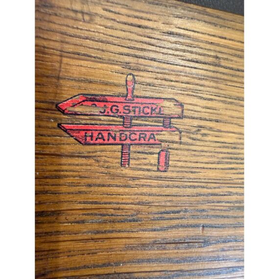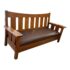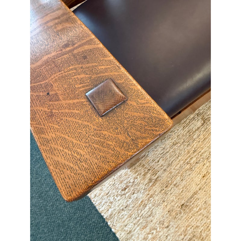Design Plus Gallery presents a Drop Arm Settee by L & JG Stickley. This is a vintage to antique aged piece that has tiger oak wood construction with wide arms, a leather fixed seat in oxblood, a slat and bowed seat back, and pure arts & crafts style. The settee shows visible wear to the wood and leather that are consistent with usage. Overall its condition with fair due to a large chip off of the wood on the right arm. Made in the USA.