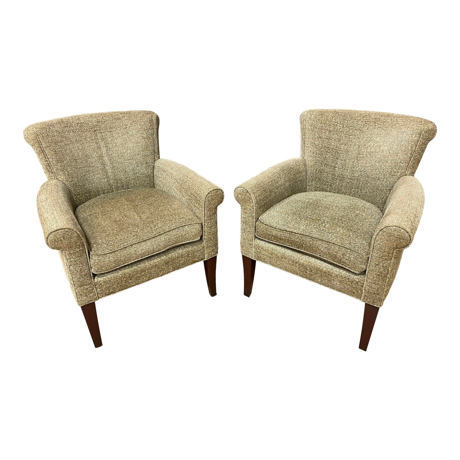 Design Plus Gallery presents a pair of Chenille Arm Chairs by Stickley Furniture. Visible fading from sun exposure. Soft chenille fibers blends an earthy green with warm tones. Saber shaped Chestnut toned legs support the solid wood frame.