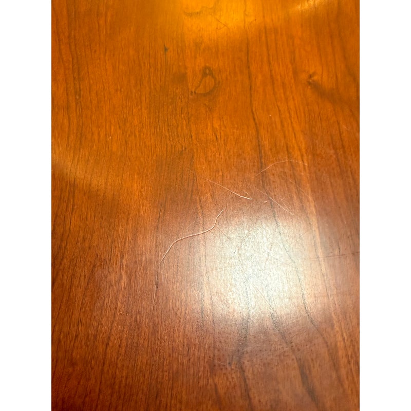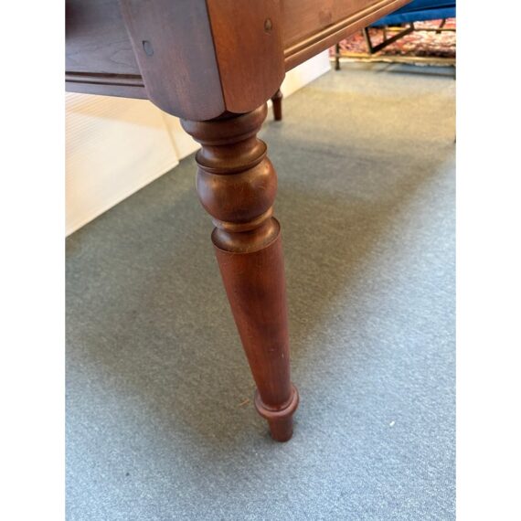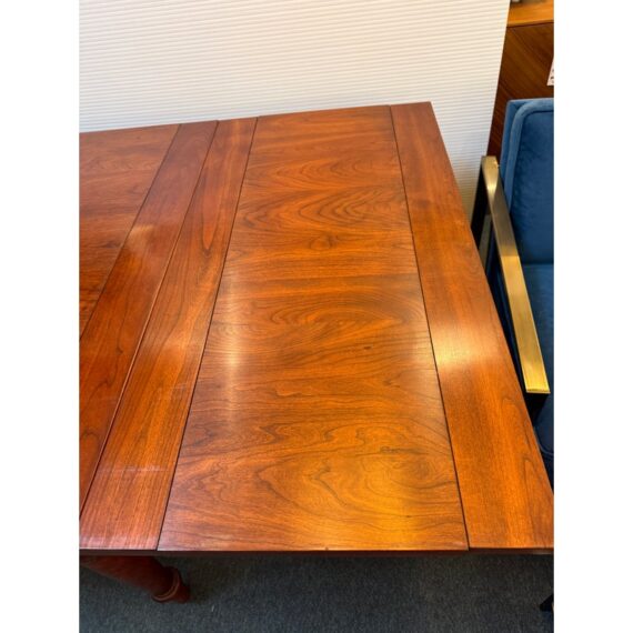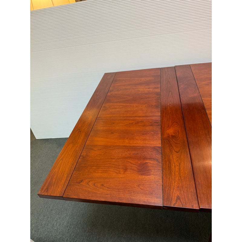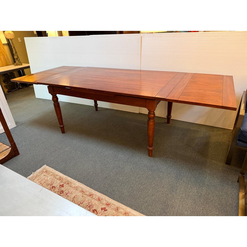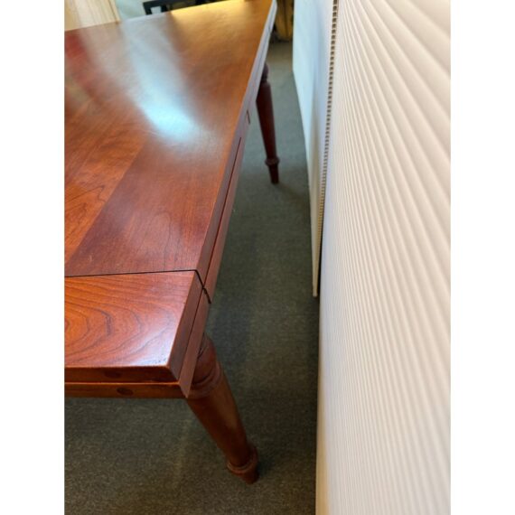 Design Plus Gallery presents a Colonial Extension Dining Table by Stickley Furniture. The richly woodgrained cherry table has been handcrafted with peg construction and beautifully turned spindle legs. The rare Colonial styled table features a pair of leaves that store inside for ready expansion to accommodate your crowd. Light visible surface wear; consistent with age and use. Made in the USA.