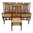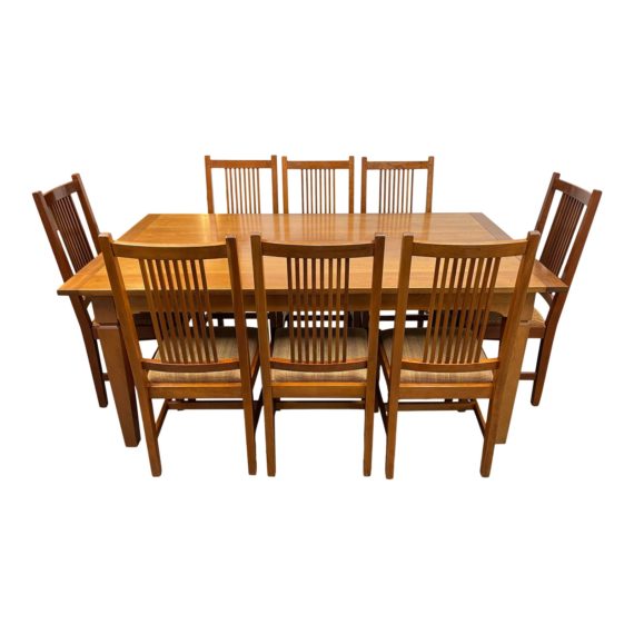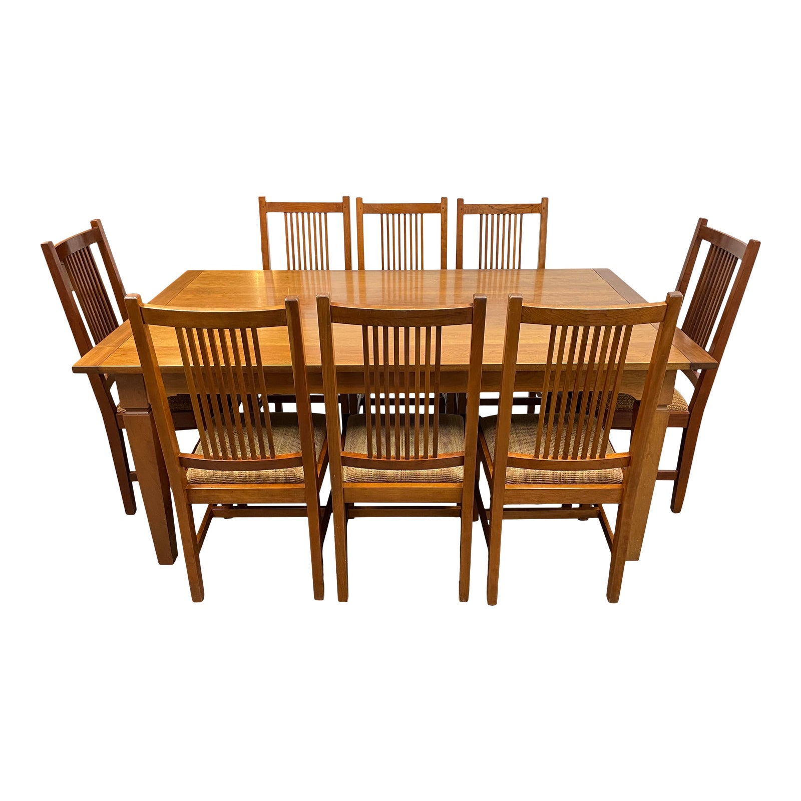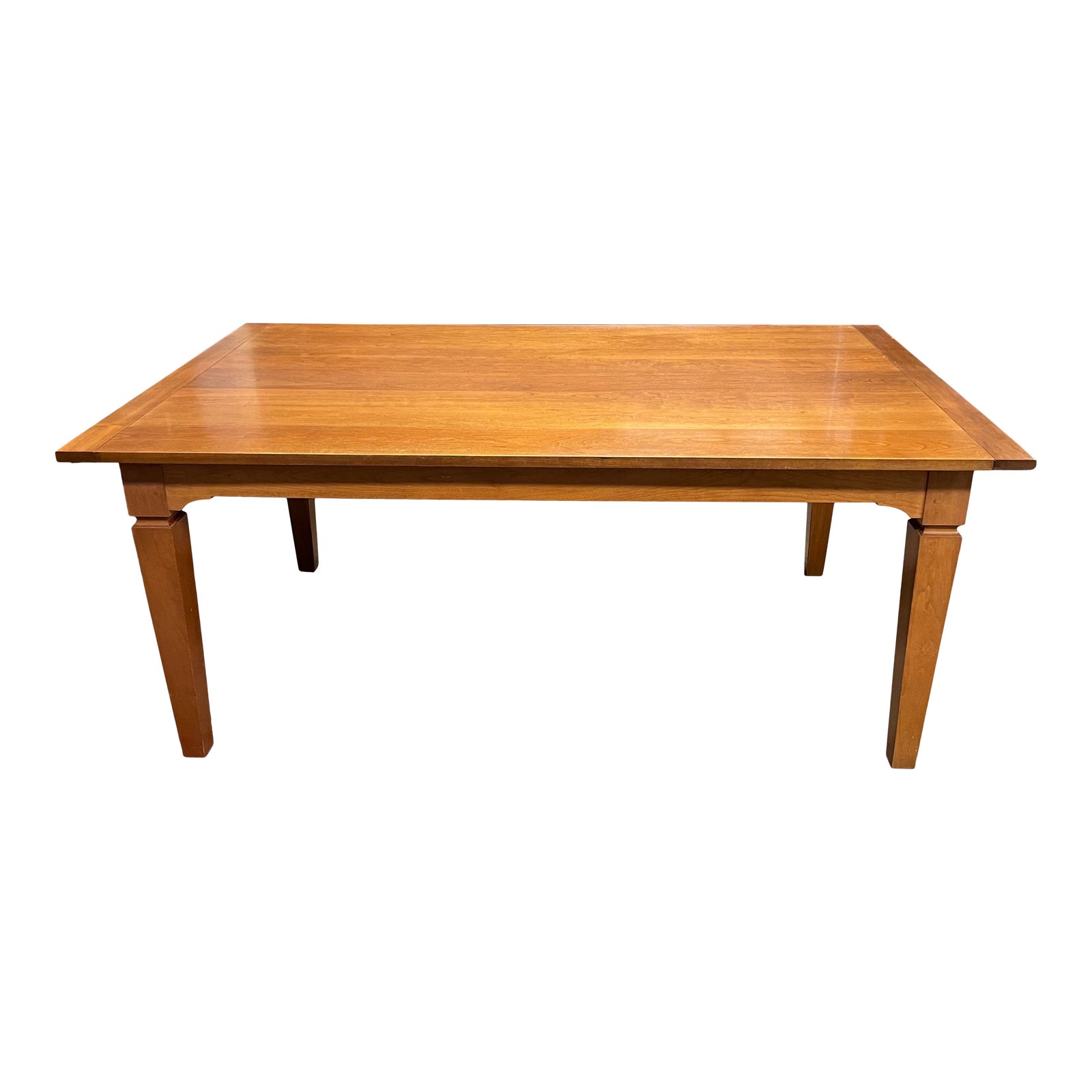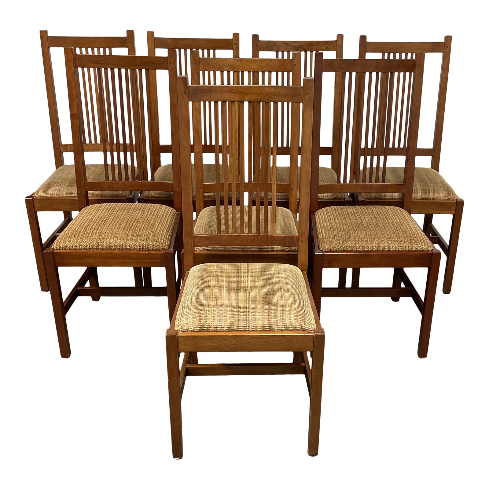 Design Plus Gallery presents a Stickley Extension Cherry Dining Set. Solid tapered legs join with mortise and tenon craftsmanship to the elegant apron and top. Top surface shows wear (pictured.) Good condition. Support bars slide out from the apron to support a leaf on each side. Stamped and marked on the bottom. Chairs have a classic Mission style back splat detail which reached high for ample back supports. Trestle bases reinforce the integrity of dovetail joinery. Seats are upholstered with a vibrant and warm weave in a muted palette to blend easily with a multitude of schemes.